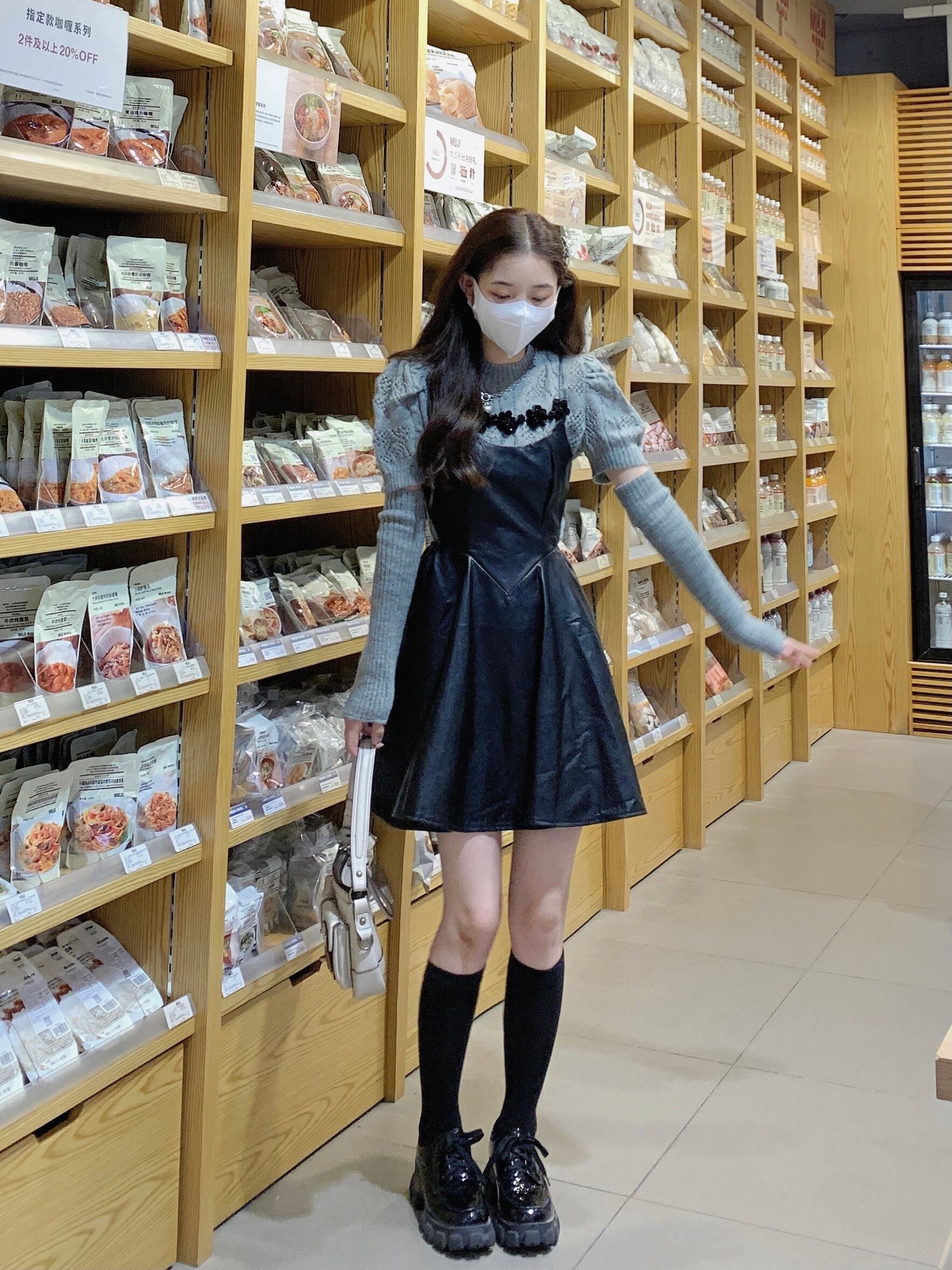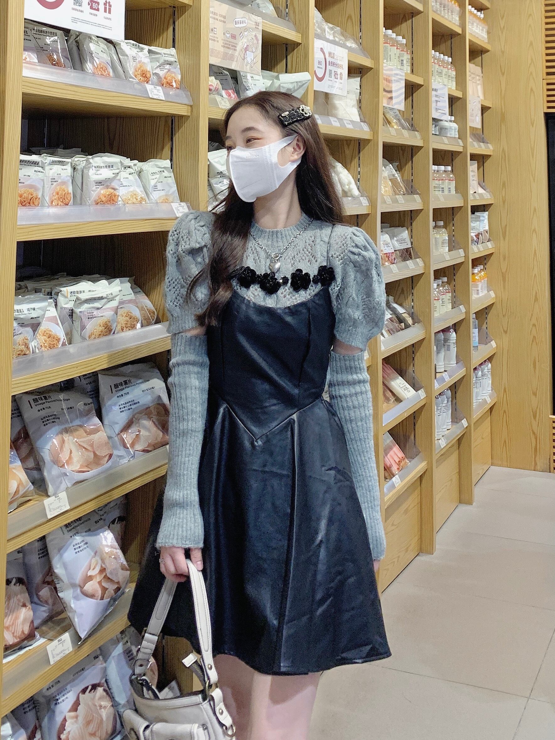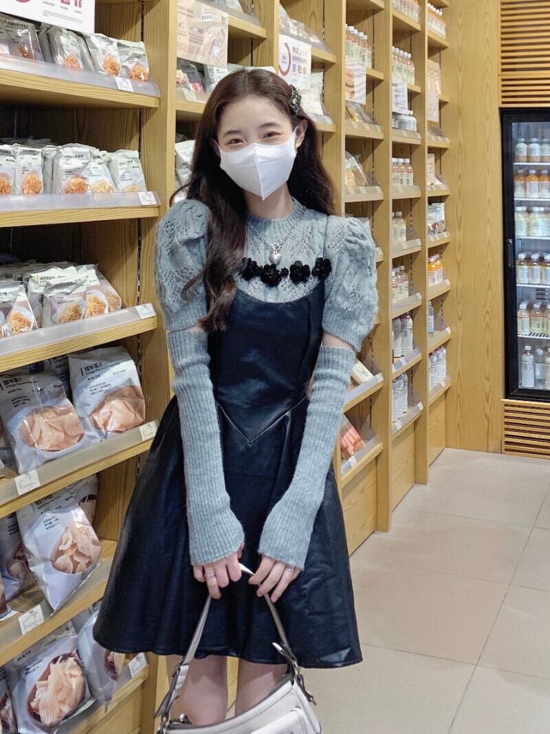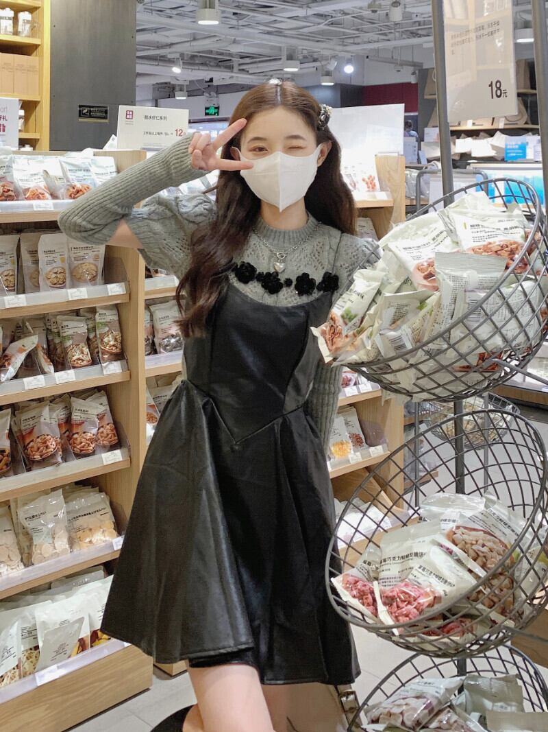 スーツ レディース スリム ストラップ レザー ドレス 立体フラワー ニット セーター トップ ツーピース セット 服 フラワーデザイン got85106789925