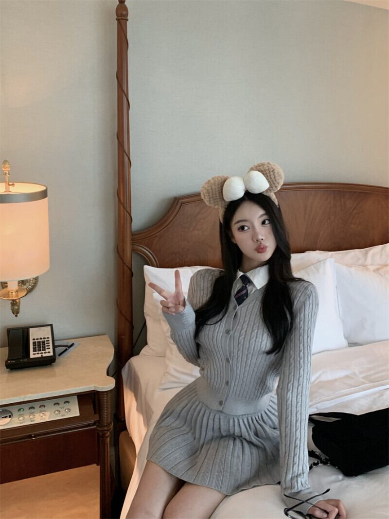 ガールスーツ女性の秋の長袖シャツグレーニットカーディガンウエストプリーツスカートネクタイ 4 ピーススーツ ロング オータム 秋物 got24515913116