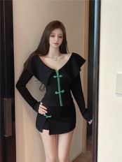 スーツの女性の春のセクシーなワンショルダーチャイナボタントップウエストスリム A ラインスカート 2 点セット服 スプリング 春物 Aライン got9292634680