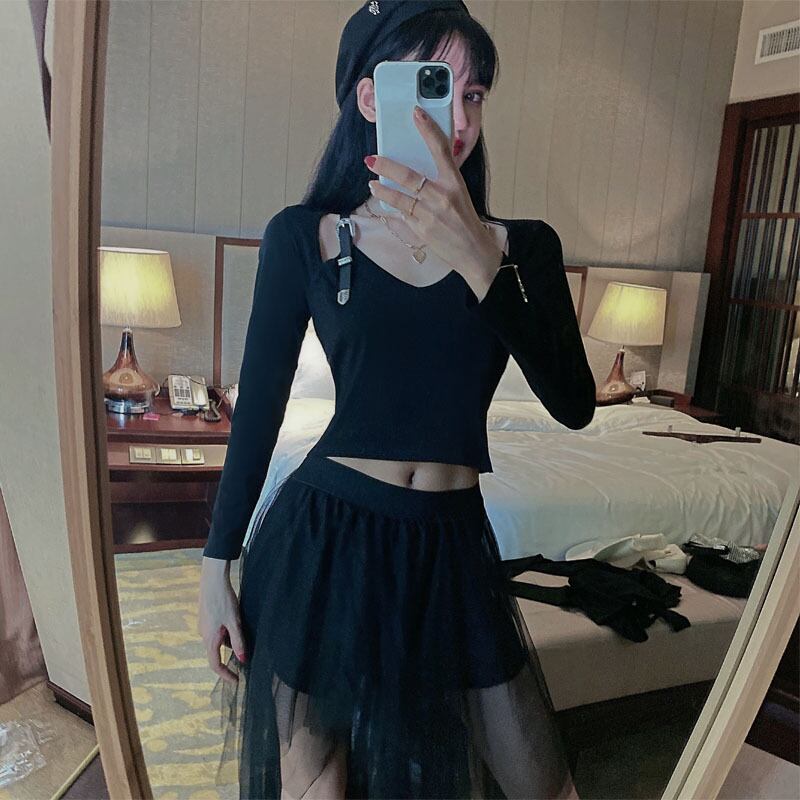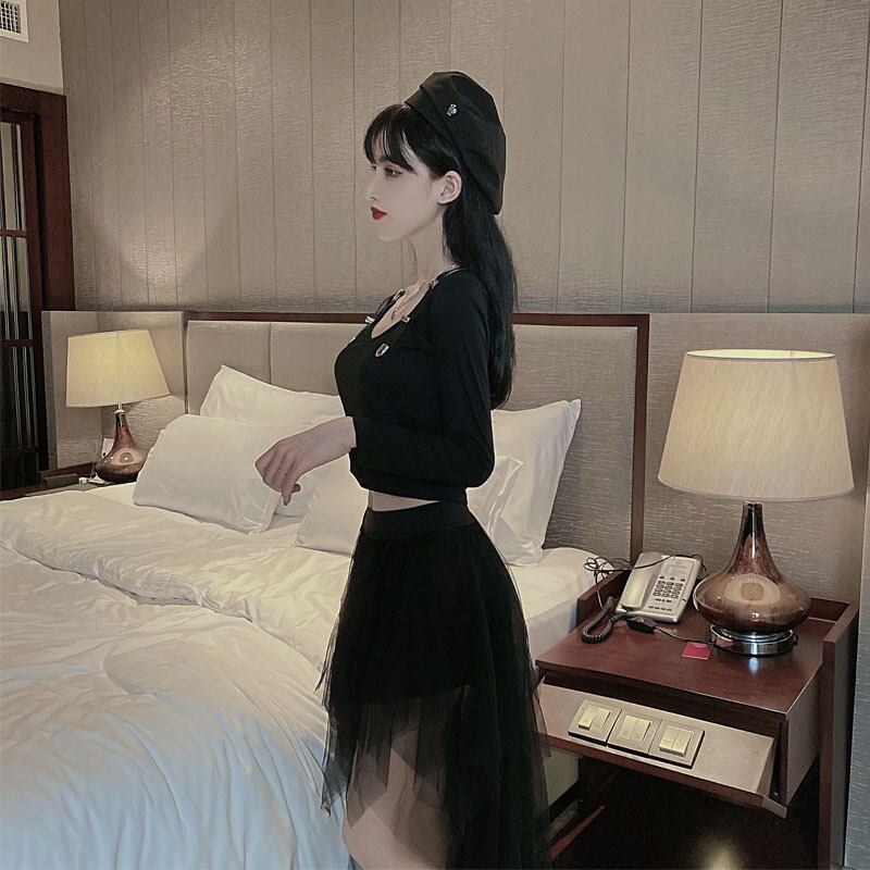 ホットガールスーツ女性の春 V ネックショートスリム長袖 Tシャツ不規則なメッシュスカート 2 点セット服 ロング スプリング 春物 Vネック got66456914234