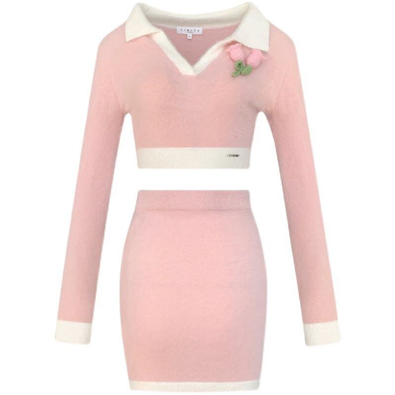 スウィートガールピンクスーツ女性のミンクショートポロカラートップウエストラップヒップスカート 2 点セット服 大人ガーリー キュート カジュアル got82662893885