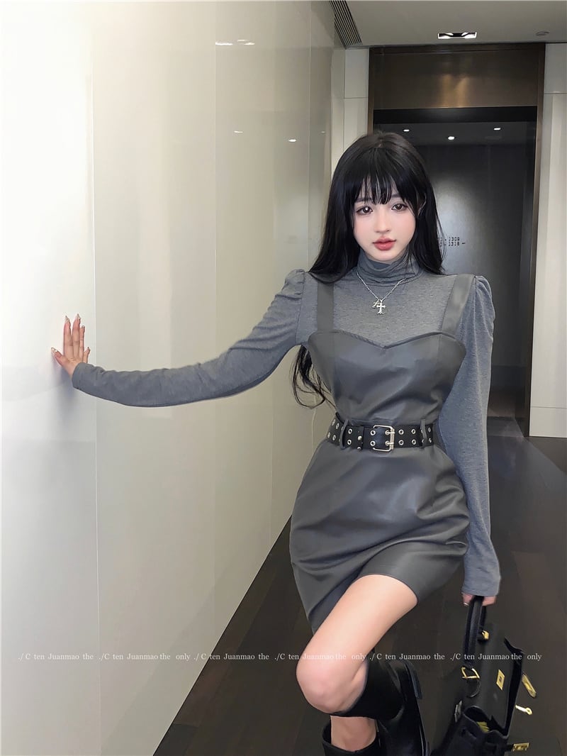 スーツ レディース 有能 バブルスリーブ ネック ニット ボトムス トップス サスペンダー レザー スカート 2点セット got53758716230