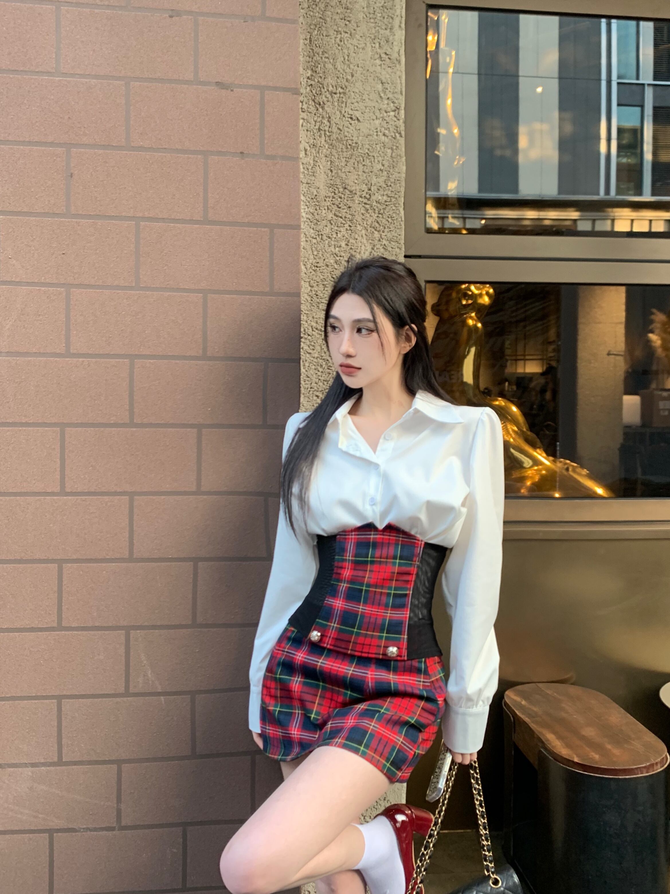 春物スーツ レディース 長袖 シャツ トップウエスト スリム 着脱式 フィッシュボーン チェック スカート ウエストシール 2点セット ロング スプリング got70256462607