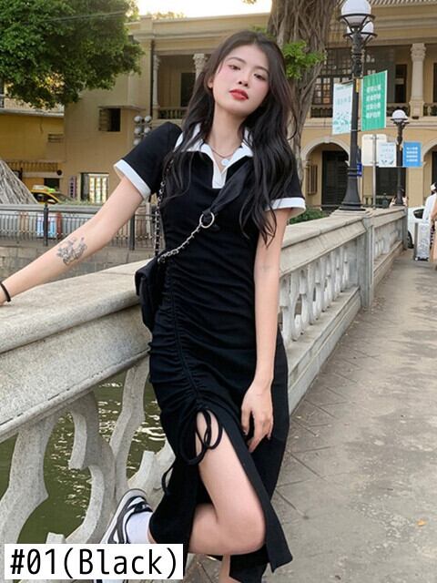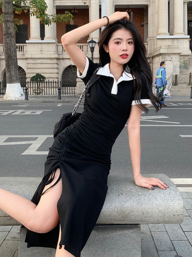 襟ドレス夏スリム巾着純粋な欲望風サイドスプリット半袖ドレス女性ローブ ショート ハーフスリーブ サマー 夏物 ピュア got56153372890