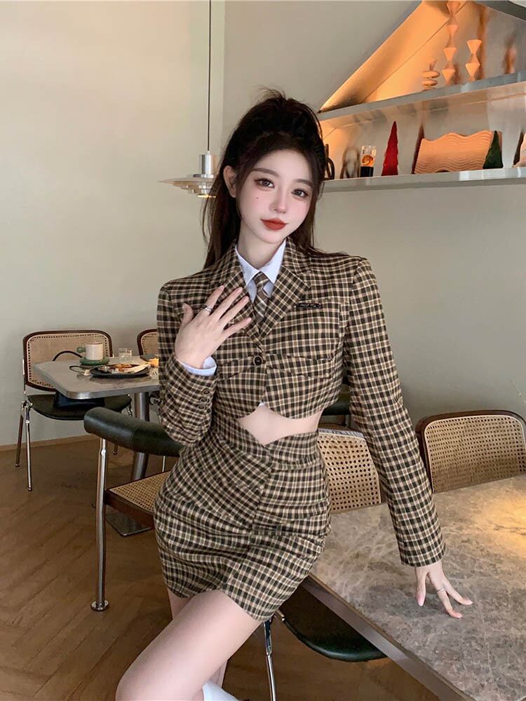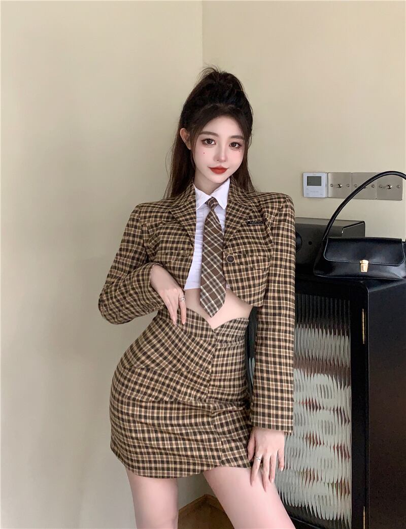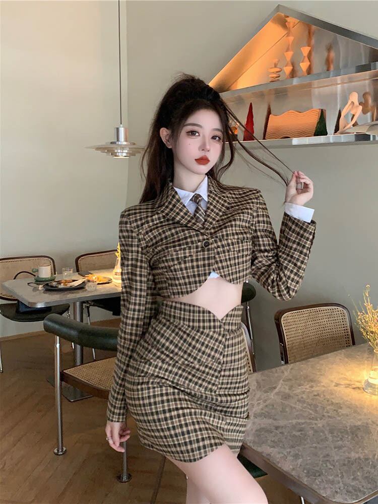 Gothiscyn 3 ピース スカート セット女性チェック柄スーツ ジャケット白シャツ クロップ トップス女性ミニ スカート セット セクシー ホワイト got24404118309