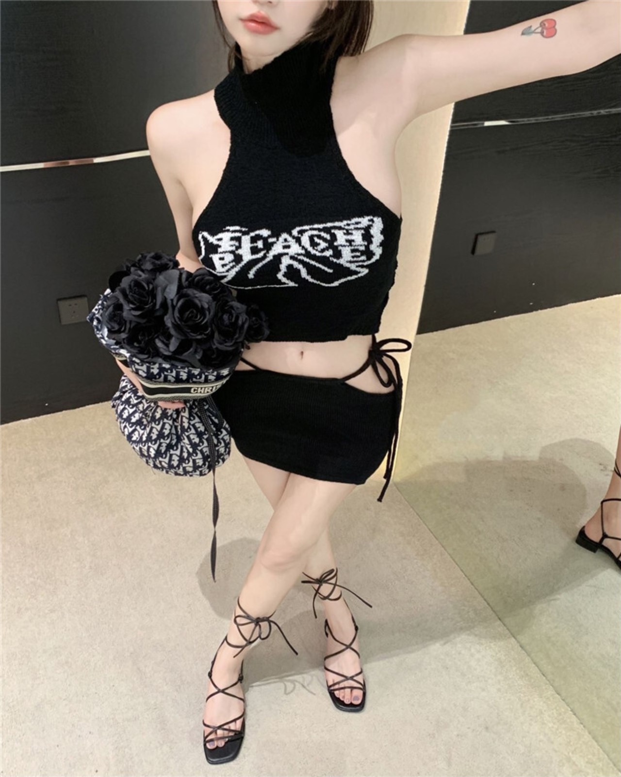 Sweet-cool Hot Girl スーツ バタフライ ノット バック レースアップ タンクトップ ウエスト ホローアウト ニット ショートスカート 2点セット 大人ガーリー スウィート キュート カジュアル got92368633276