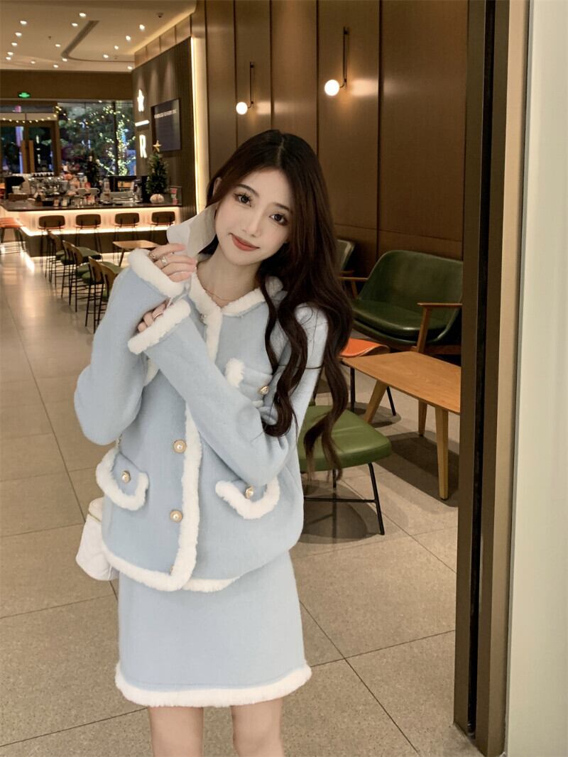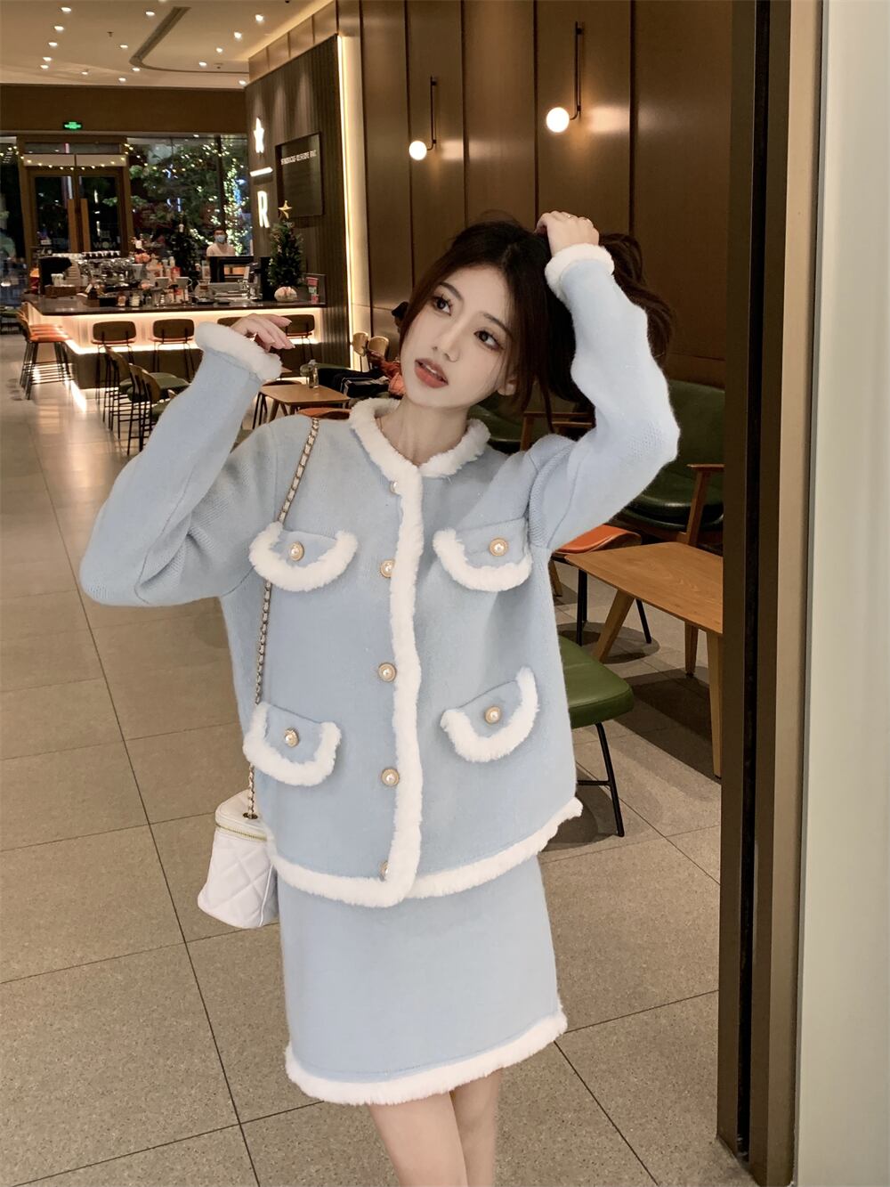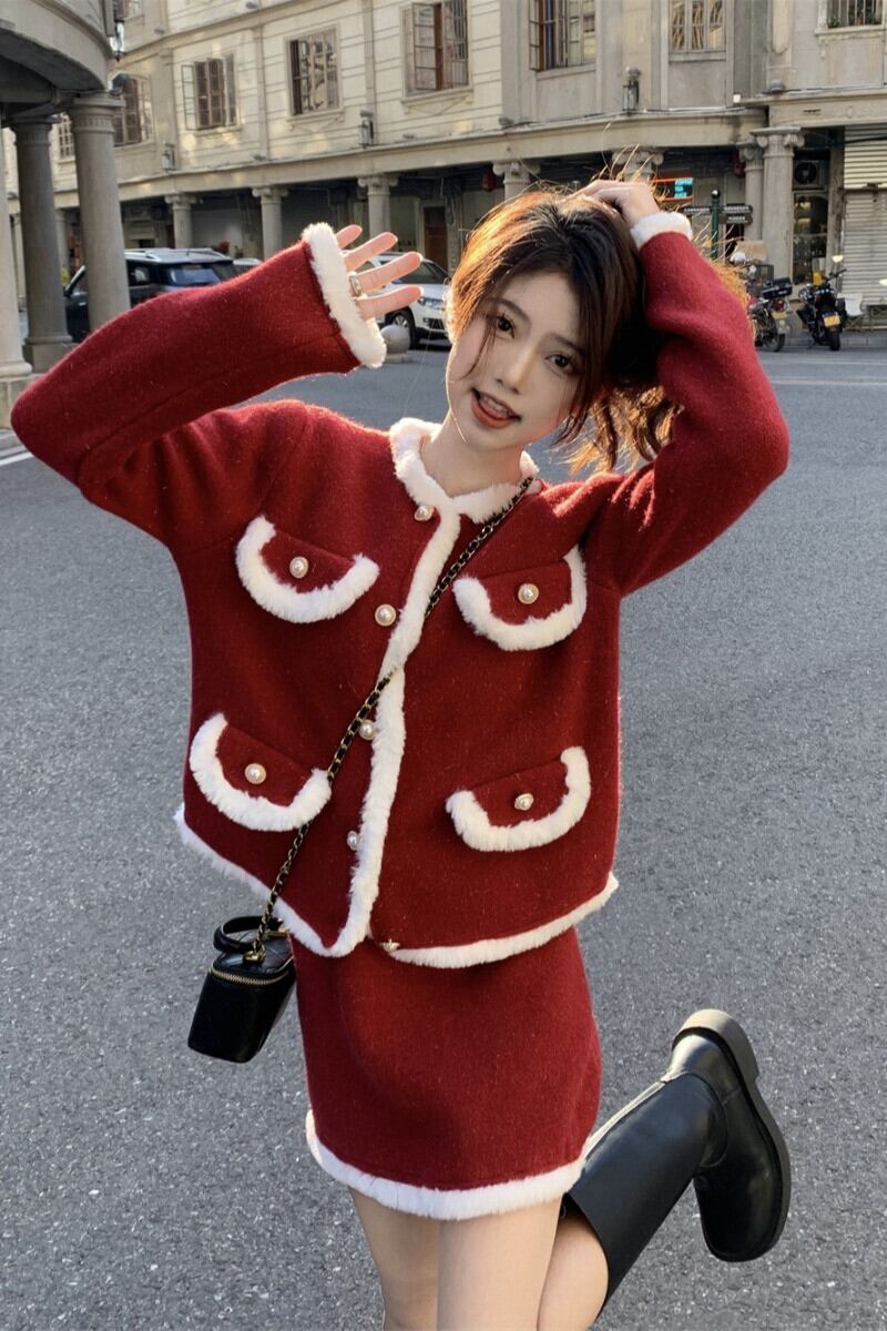 年赤フレンチスタイルのスーツの女性の長袖 O ネックコートウエストスリムラップヒップスカート 2 点セット服 ロング レッド Oネック got87107387562