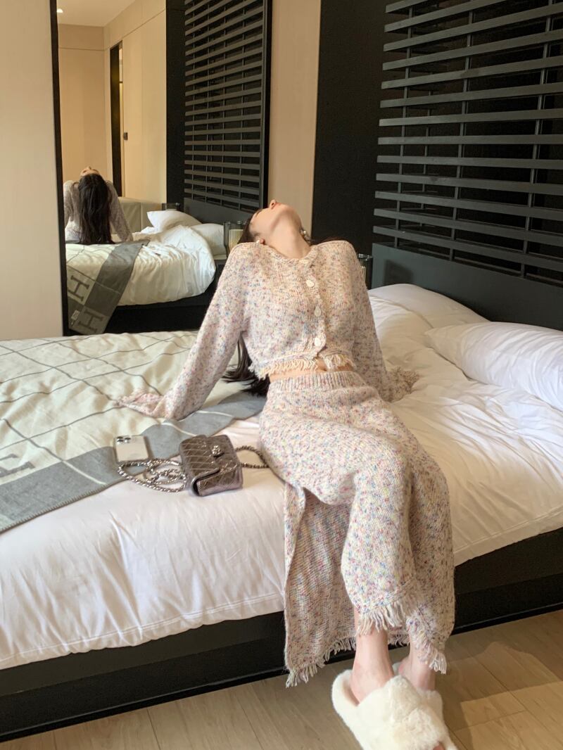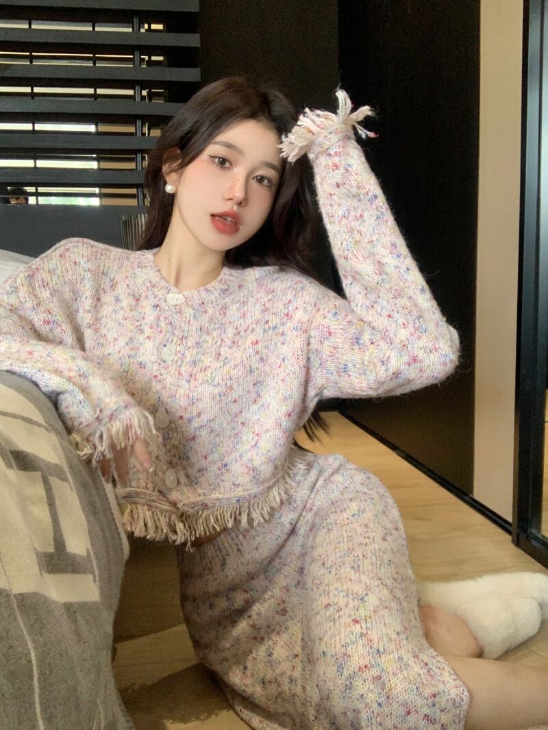 スウィートガールソフトスーツテルニットカーディガン女性の秋と冬のウエストスカートツーピースセット服 大人ガーリー キュート カジュアル オータム 秋物 ウィンター 冬物 got84726964295