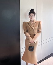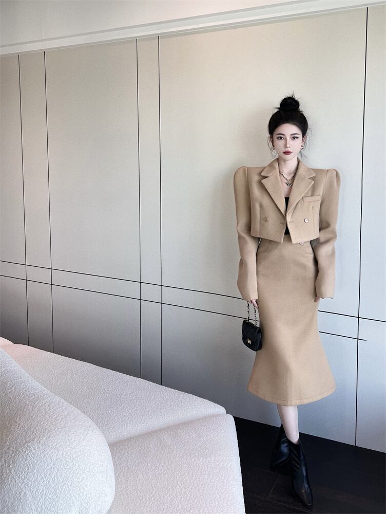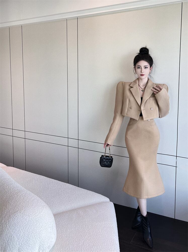 オフィスレディ通勤スーツ中国ターンダウン襟ウールショートコートウエストマーメイドスカートツーピースセット服 会社 学校 通勤や通学にも got95617652220