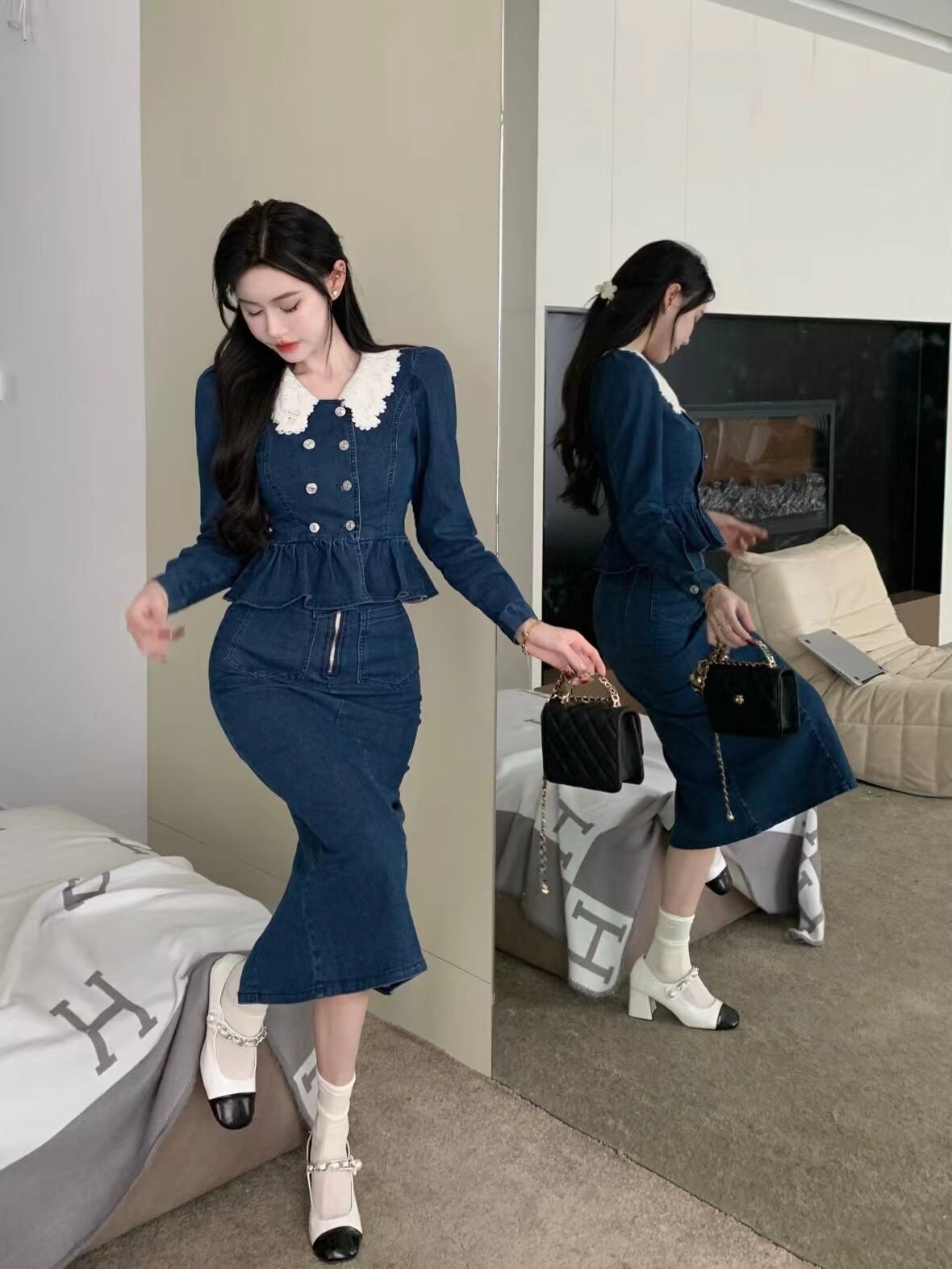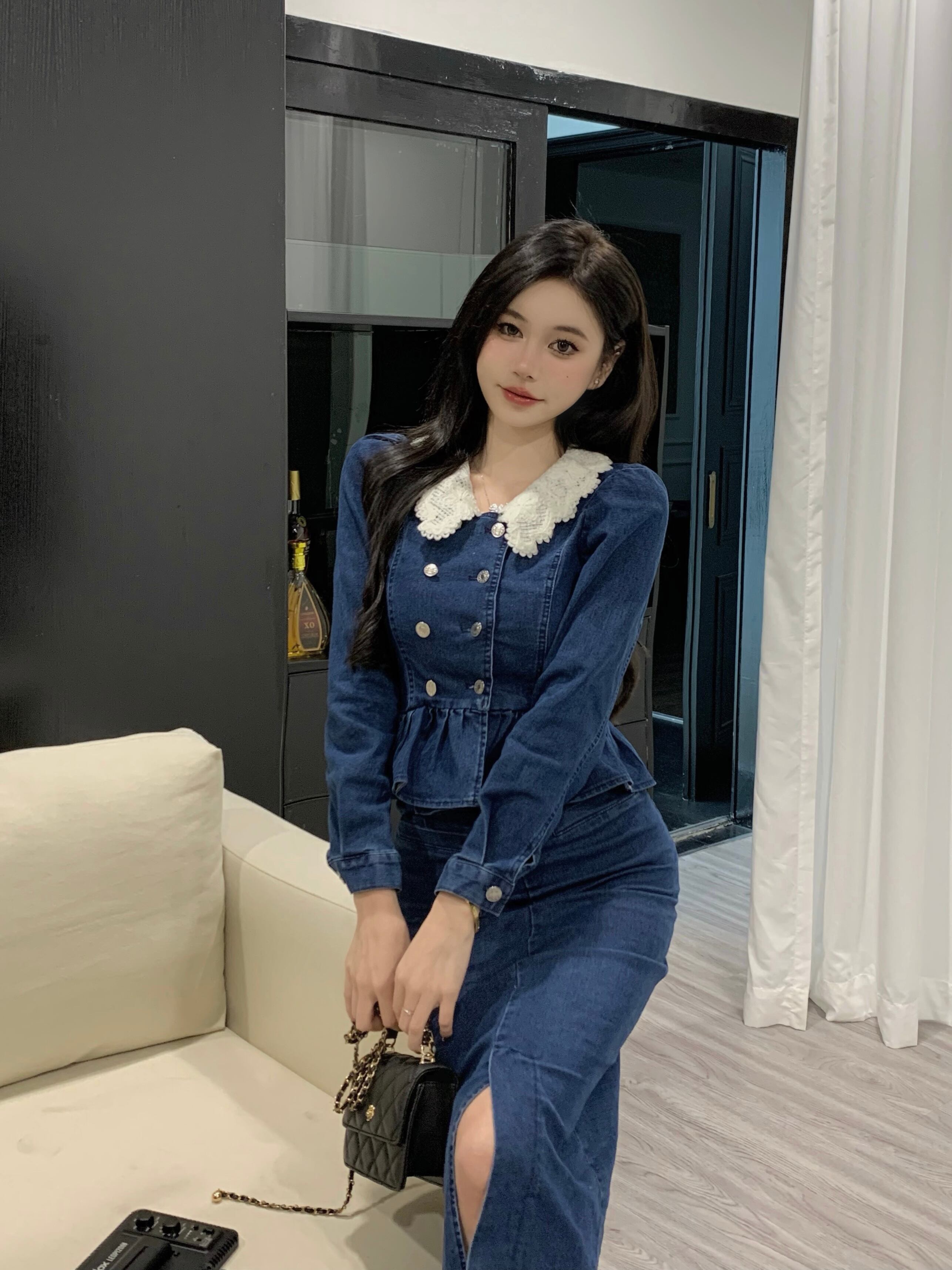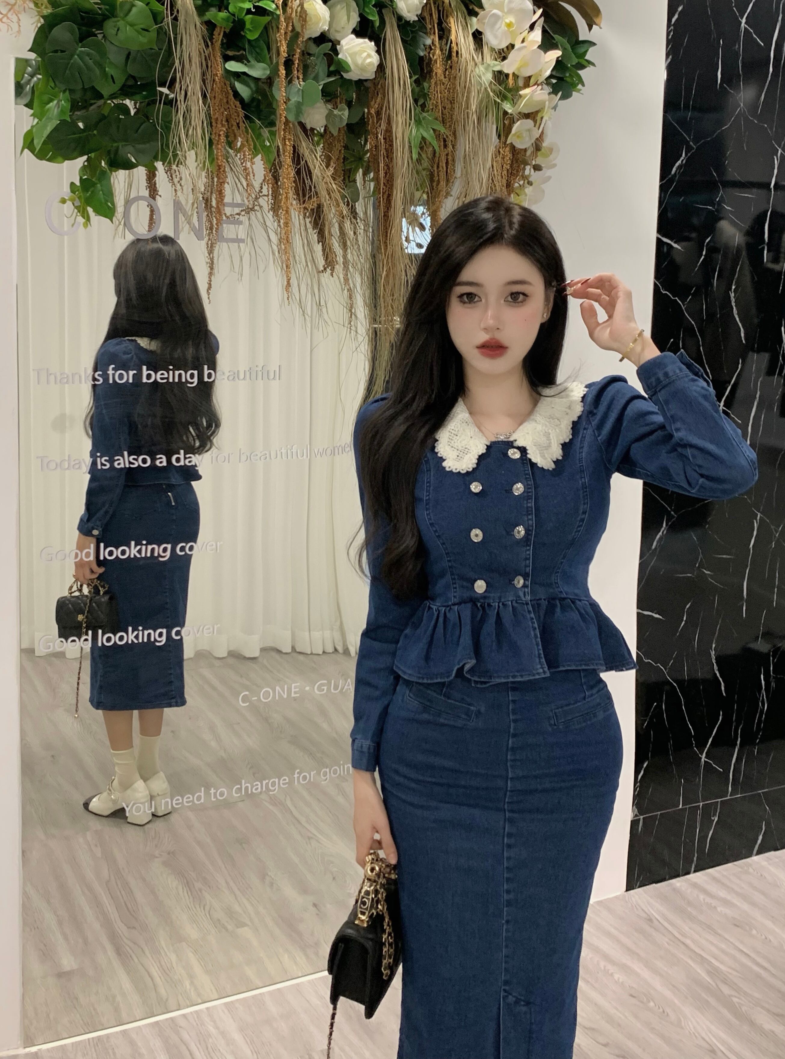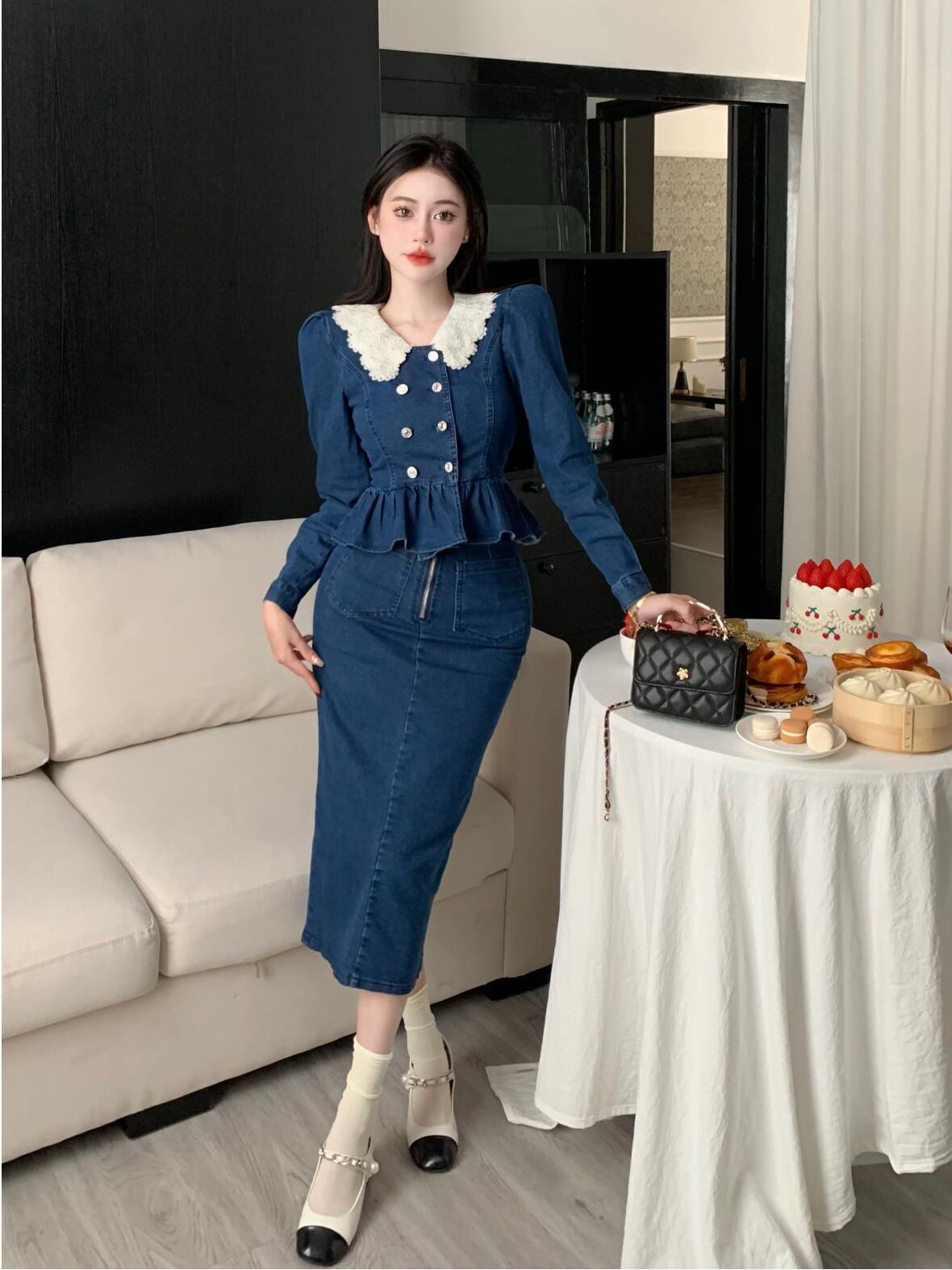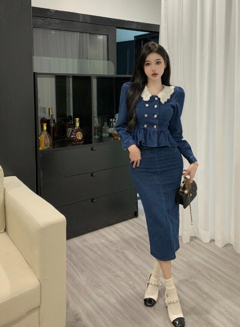 オフィスレディ 通勤スーツ レディース レース ターンダウンカラー デニム ショートコート ウエストスリットスカート 2点セット 会社 学校 通勤や通学にも got42496088154