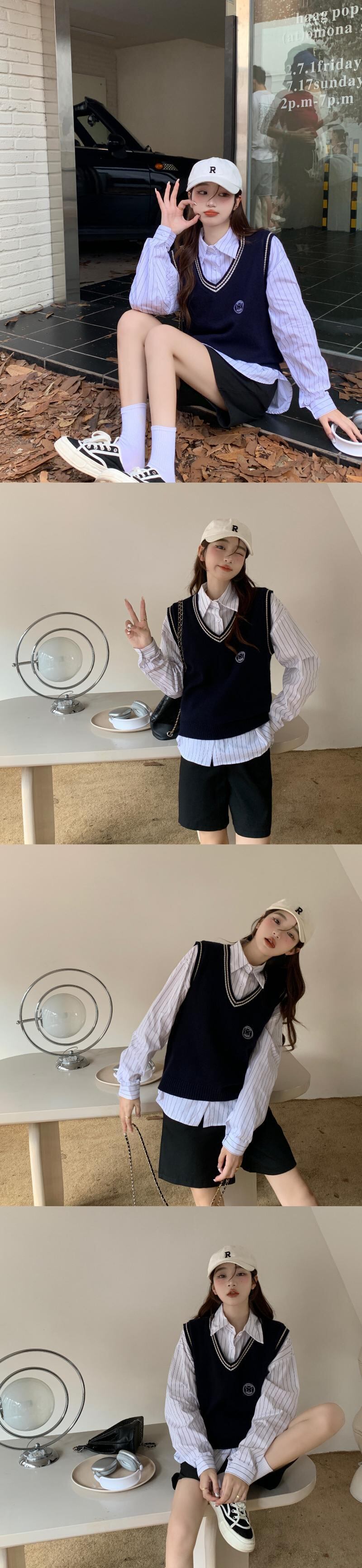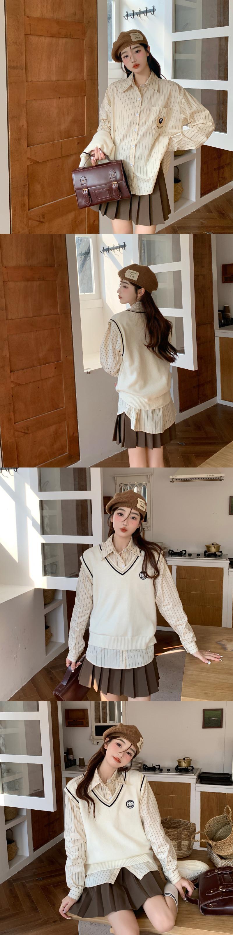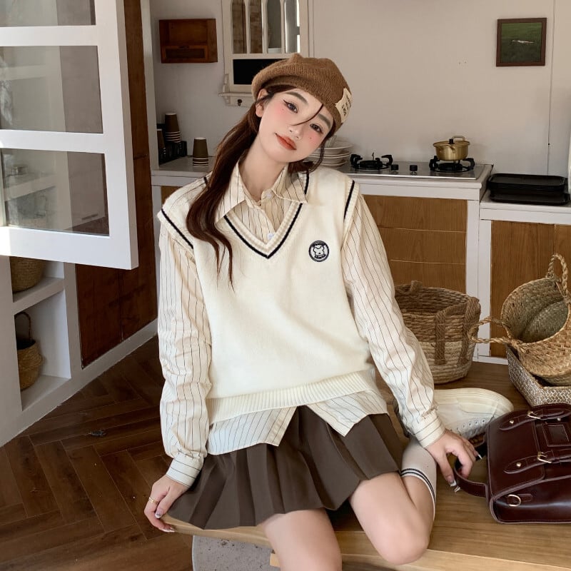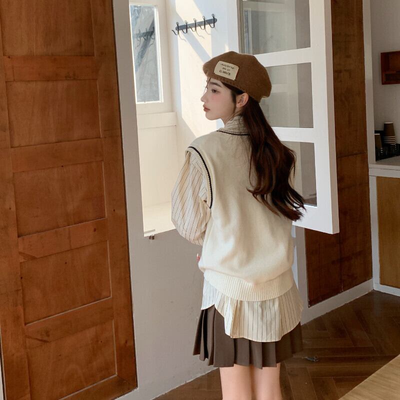 初秋のスーツ ゆったり Vネック ノースリーブ セーター ベスト シャツ プリーツスカート風 3点セット 洋服 オータム 秋物 got79487472764