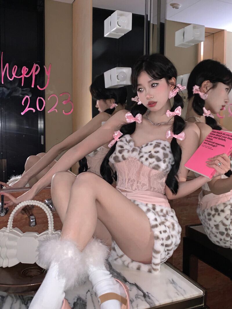 ホットガールスーツ女性のフィッシュボーンレースパッチワークサスペンダートップヒョウ柄ぬいぐるみショーツ 2 点セット服 ブルマー got5220912459