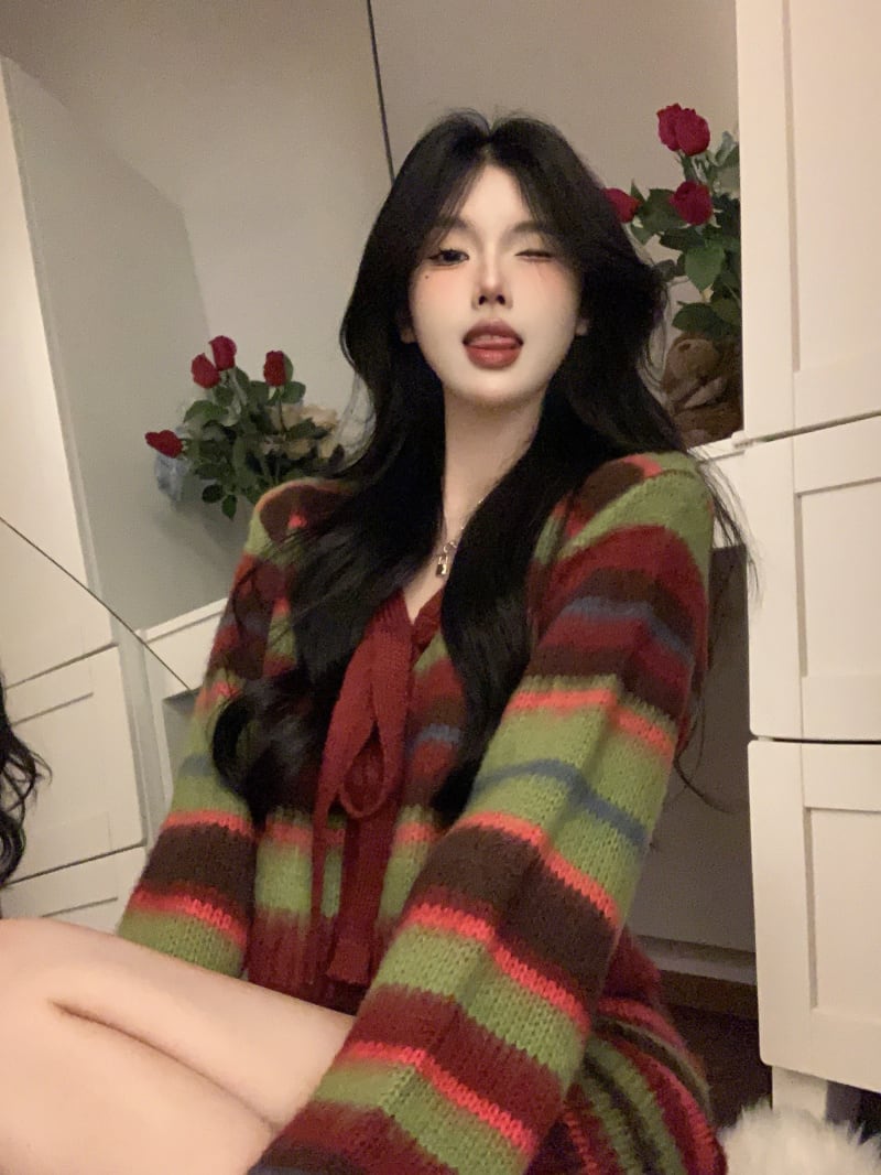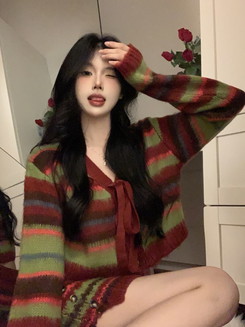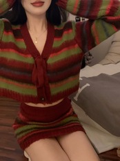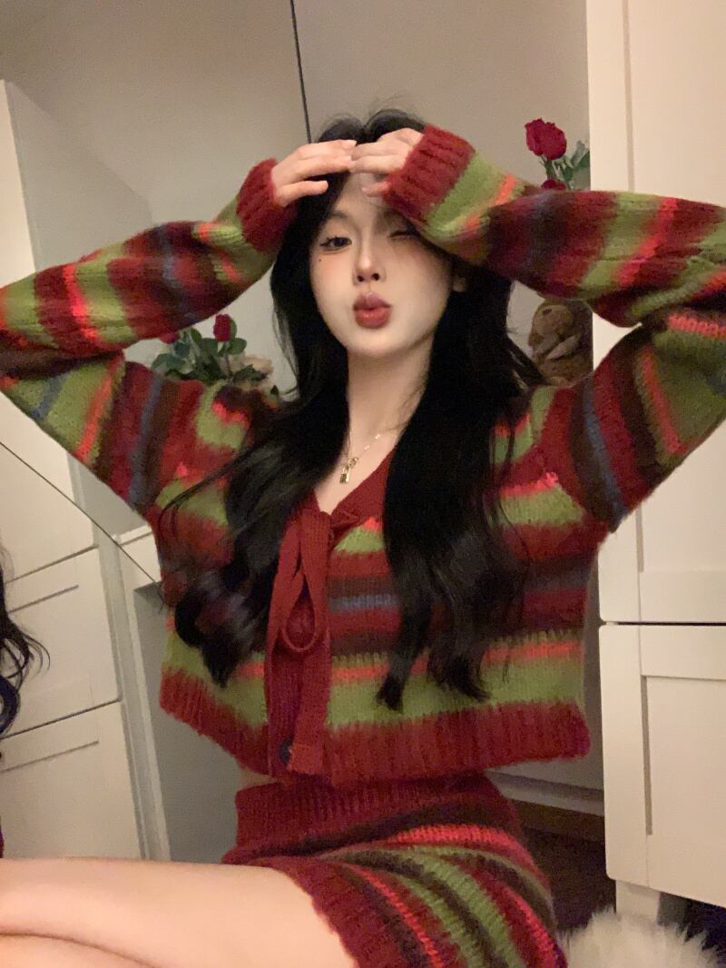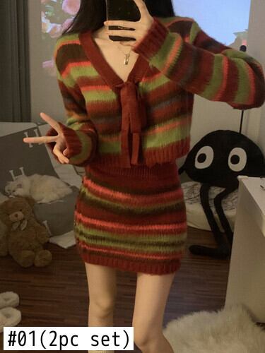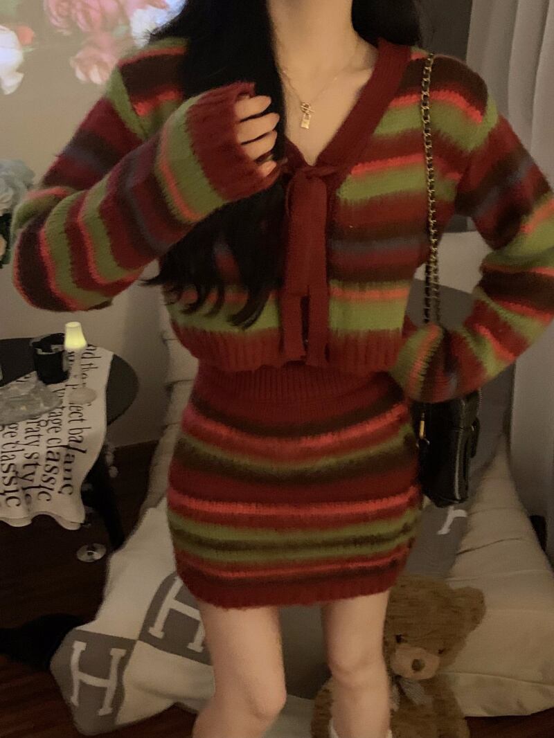 スタイル 女の子 スーツ 秋冬 モヘアストライプ スリム ニット カーディガン セーター レディース ウエストスカート 2点セット オータム 秋物 ウィンター 冬物 got50419426550