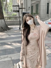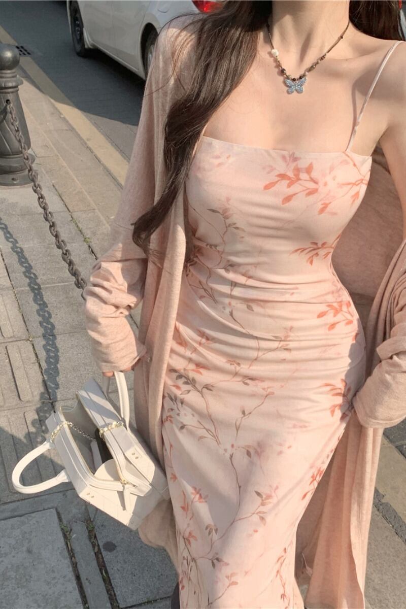 スウィート ガール スーツ女性の花柄サスペンダー ドレス春-グレード長袖スリム カーディガン 2 点セット服 ロング 大人ガーリー キュート カジュアル スプリング 春物 got89478134374