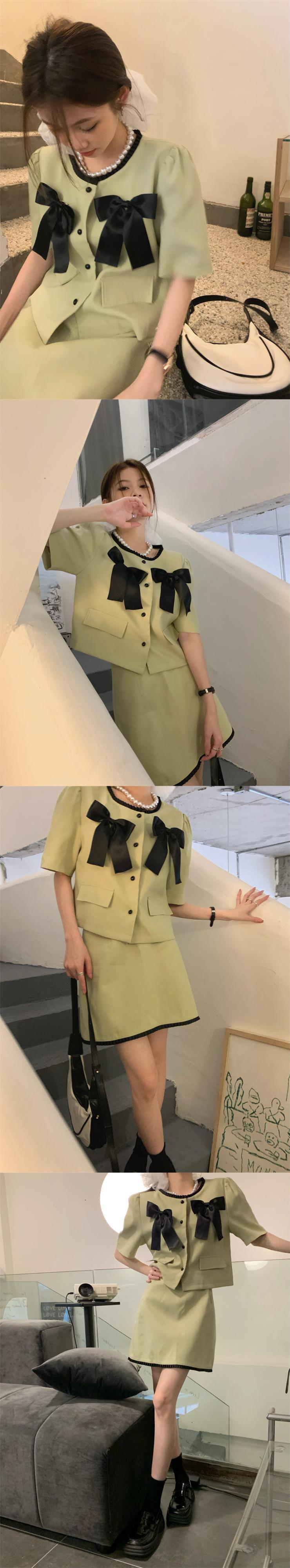コントラストカラーボウスーツレディース春半袖トップウエストAラインスカートツーピースセット服 リボン スプリング 春物 got98178728938