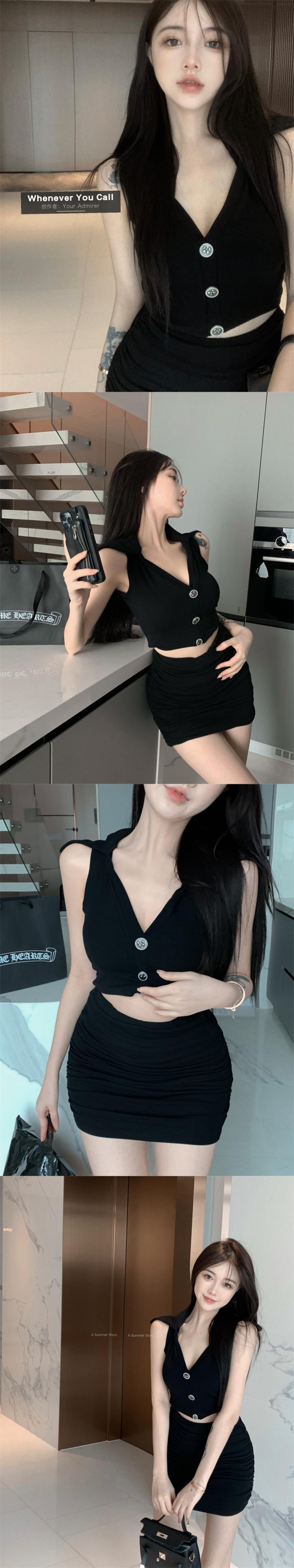 アメリカン ホット ガールズ スーツ女性のポロ襟ニット トップ無地セクシー な ウエスト プリーツ スカート服 ソリッドカラー got90517759486