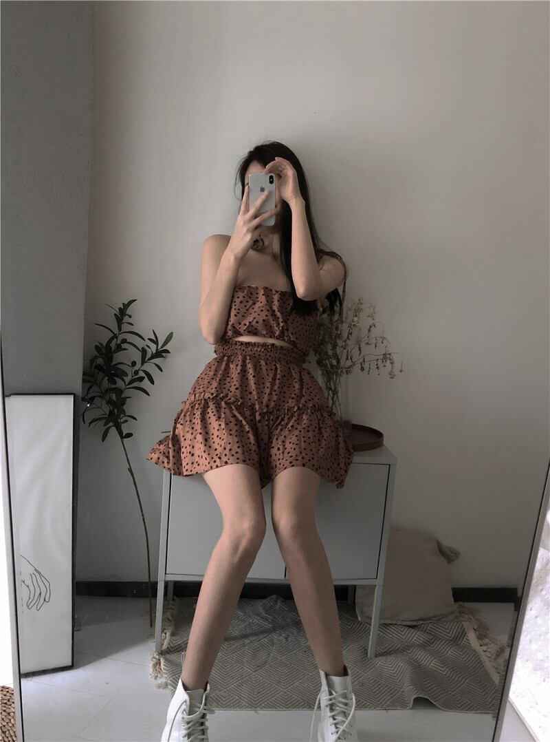 スウィートガール春スーツ女性のフレンチポルカドットショートサスペンダートップウエスト弾性スカートツーピースセット服 エラスティック 伸縮 大人ガーリー キュート カジュアル スプリング 春物 got41982770450