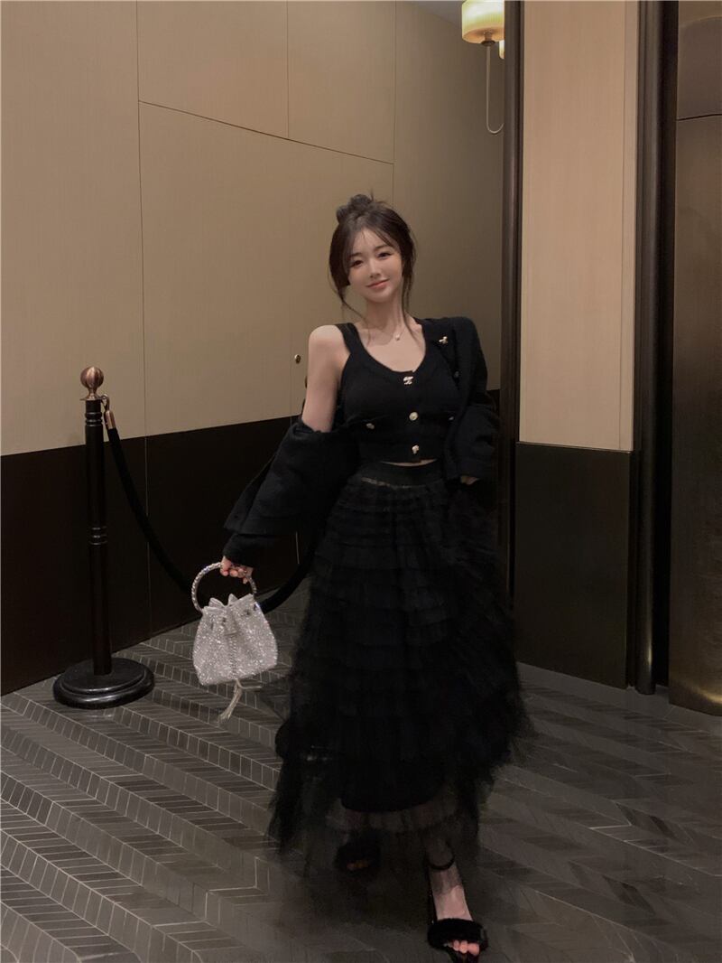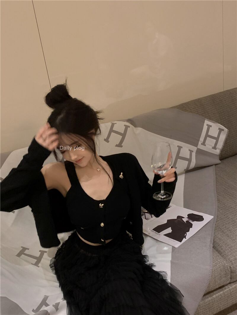 ブラック ニット コート スリム 長袖 スリング カーディガン セーター ウエスト ガーゼ ケーキ スカート 3点セット 洋服 ロング got9221833881