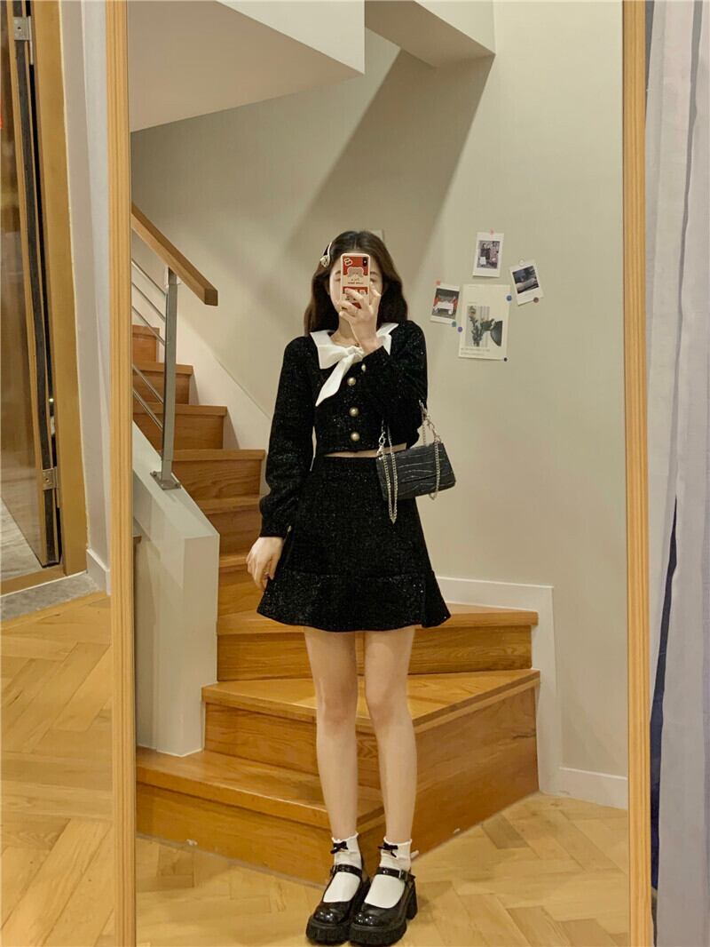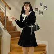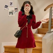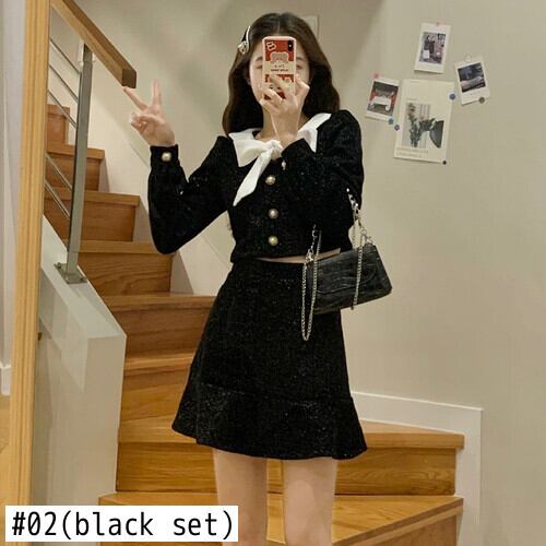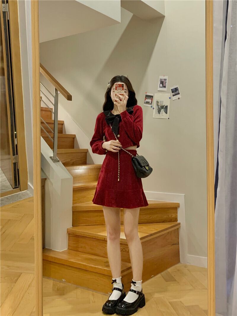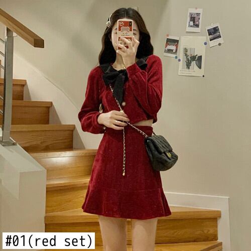 レッドベルベットスーツレディース秋冬長袖ラウンドネックリボントップコートウエストAラインスカート2点セット ロング オータム 秋物 ウィンター 冬物 Oネック got40544646195