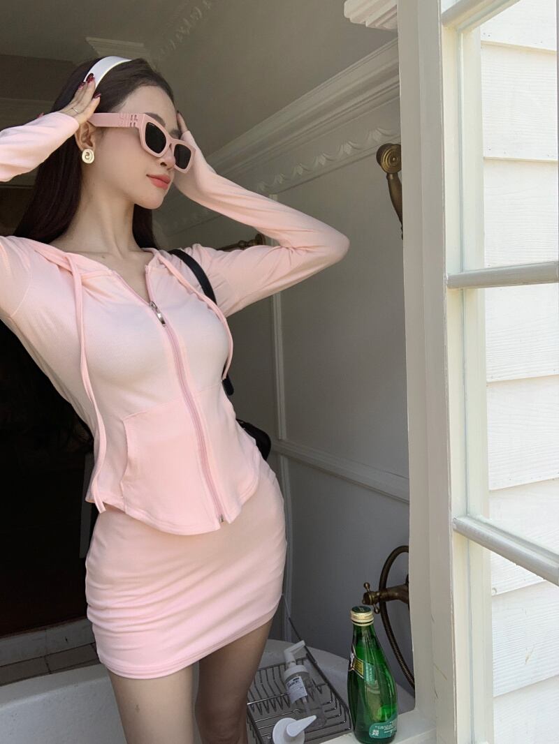 純粋なセクシーなホットガールスーツ女性の春フード付きジッパーカーディガンとヒップスカート 2 点セット服 レッド スプリング 春物 got17948044924