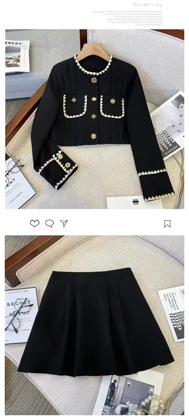 ツーピースセットレディース衣装 O ネック黒ショートコートミニプリーツスカート無地梨花服秋/冬スカートセット ブラック オータム 秋物 ウィンター 冬物 Oネック ソリッドカラー got75670217162