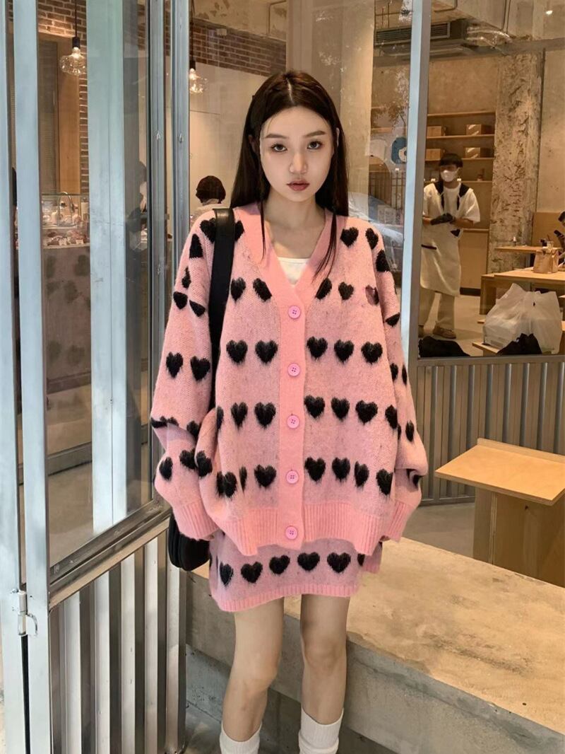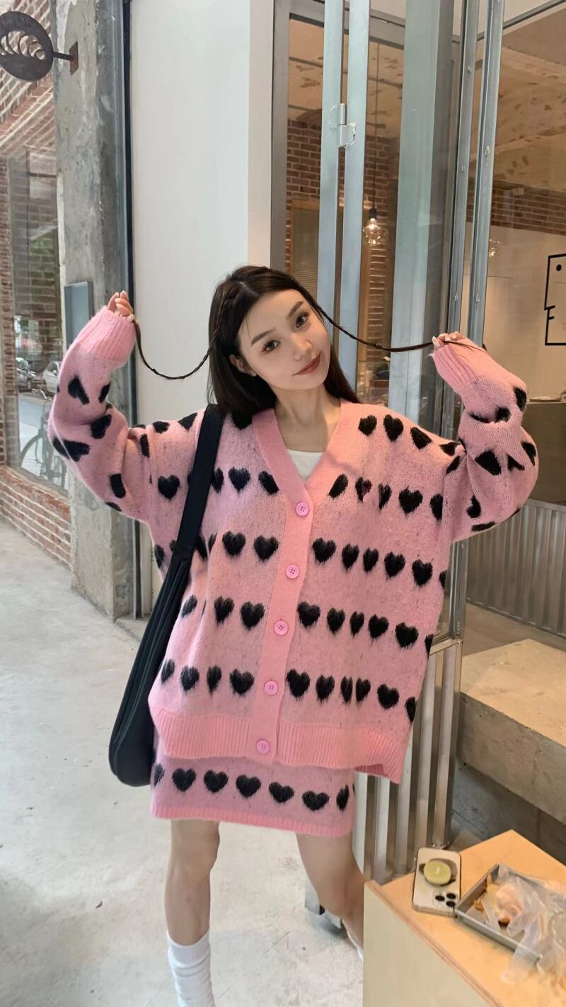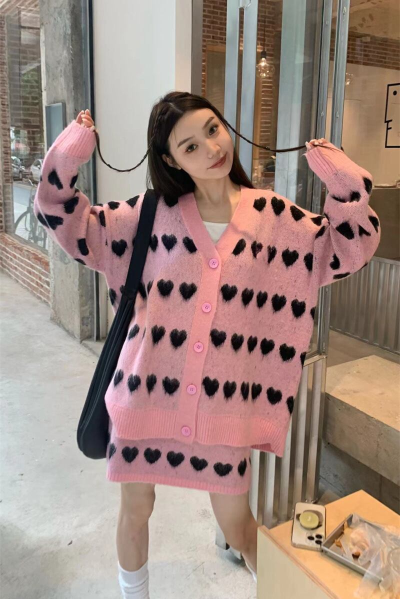甘いニットスーツハートプリントジャカードセーターカーディガンコート女性の秋のウエストスカートツーピースセット服 大人ガーリー スウィート キュート カジュアル オータム 秋物 got54078968202