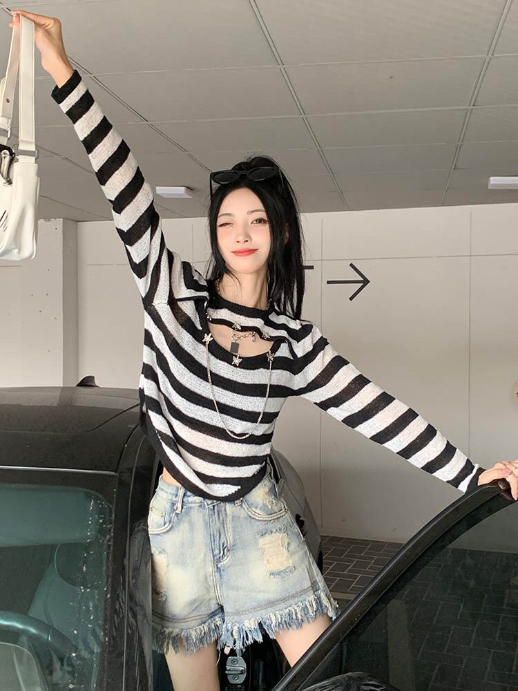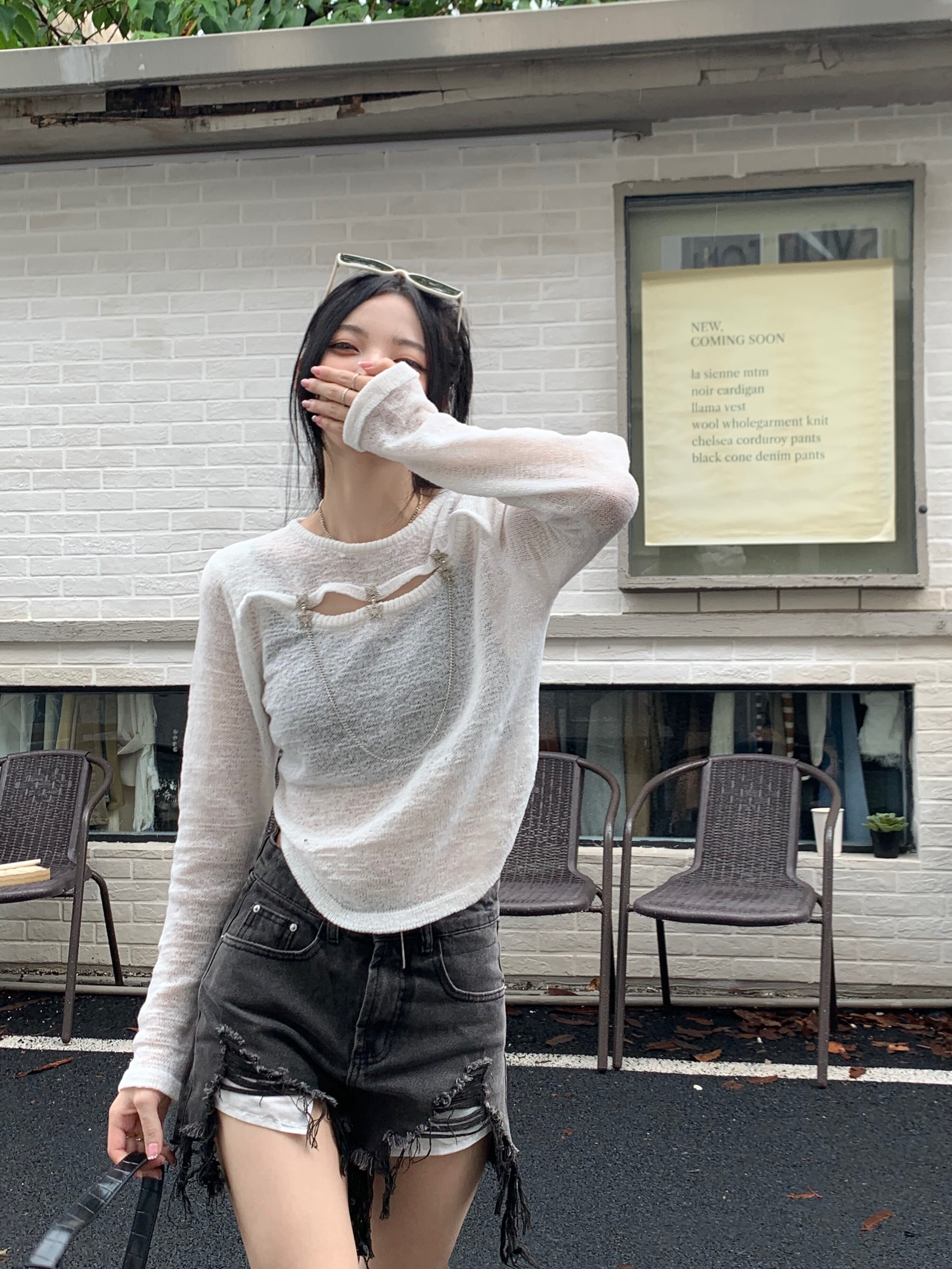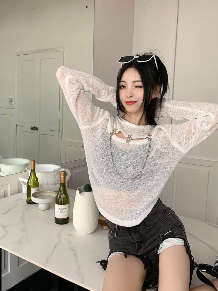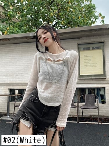 Tシャツ女性薄い白 Tシャツソリッドトップス長袖中空アウトレディース日焼け止めプレッピースタイル秋の Tシャツ ロング ホワイト オータム 秋物 ソリッドカラー got56420960417