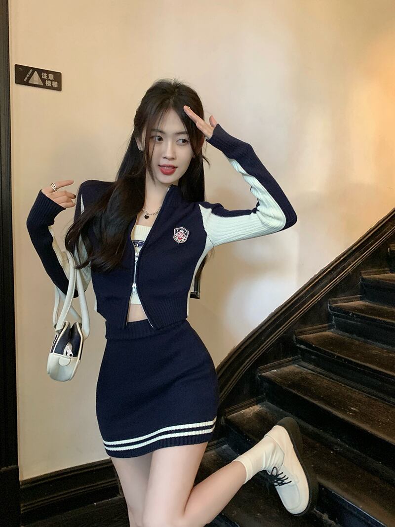 カラーコントラストスーツ レディース 春 ワッペン ダブルジップ ニットカーディガン ウエストスカート 2点セット スプリング 春物 got56014735413