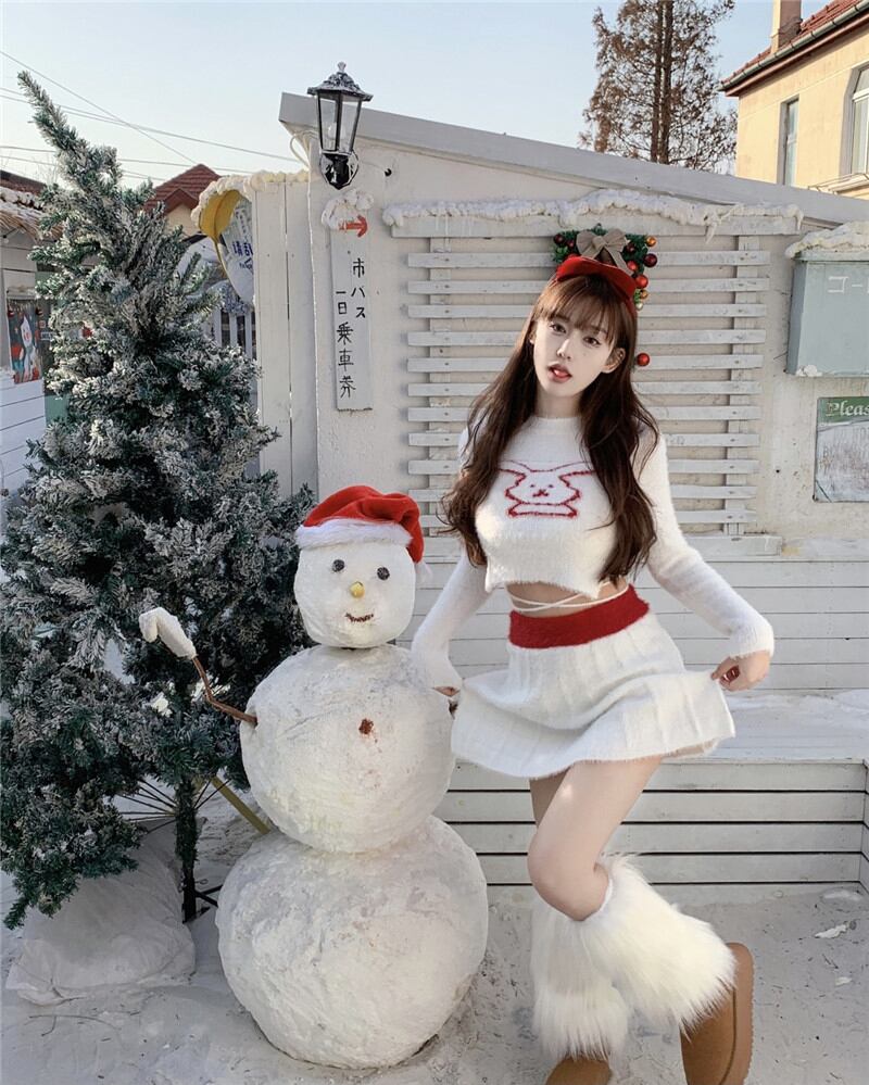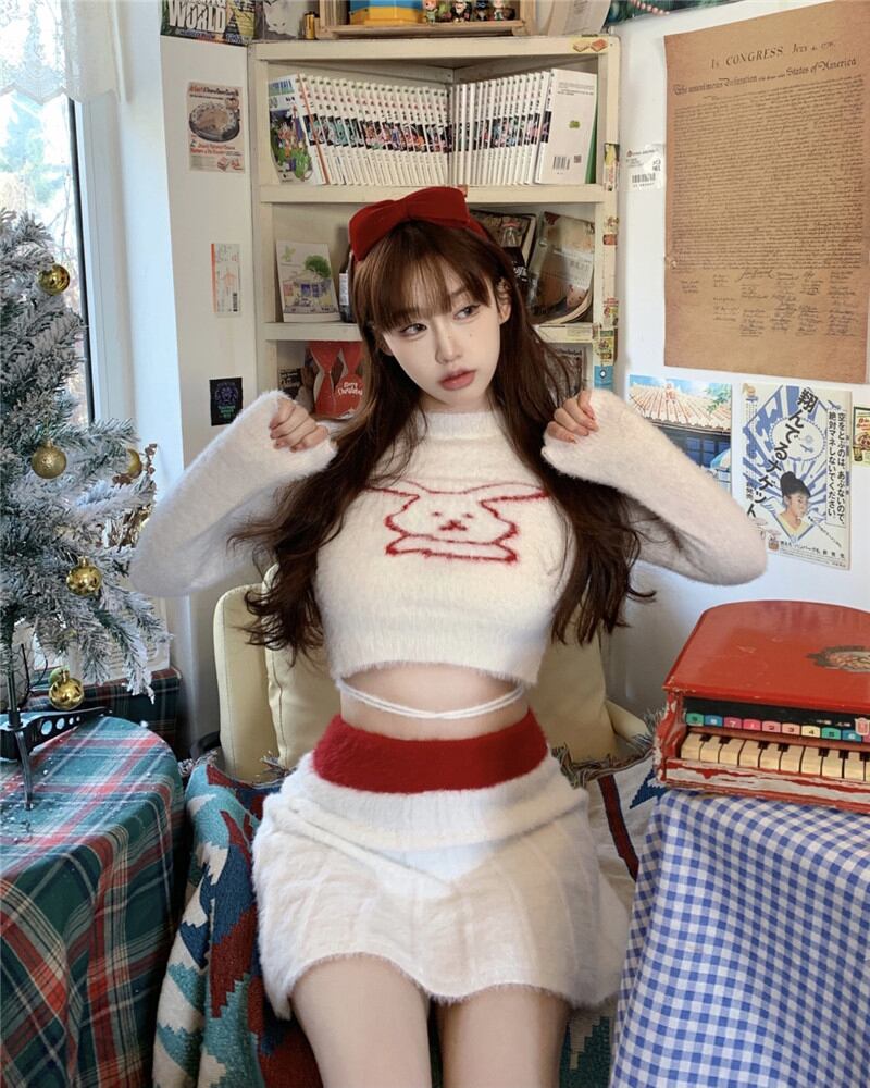 ホットガールニットスーツうさぎプリント長袖ニットプルオーバー女性の秋と冬のウエストプリーツスカートツーピースセット ロング オータム 秋物 ウィンター 冬物 got52735968775