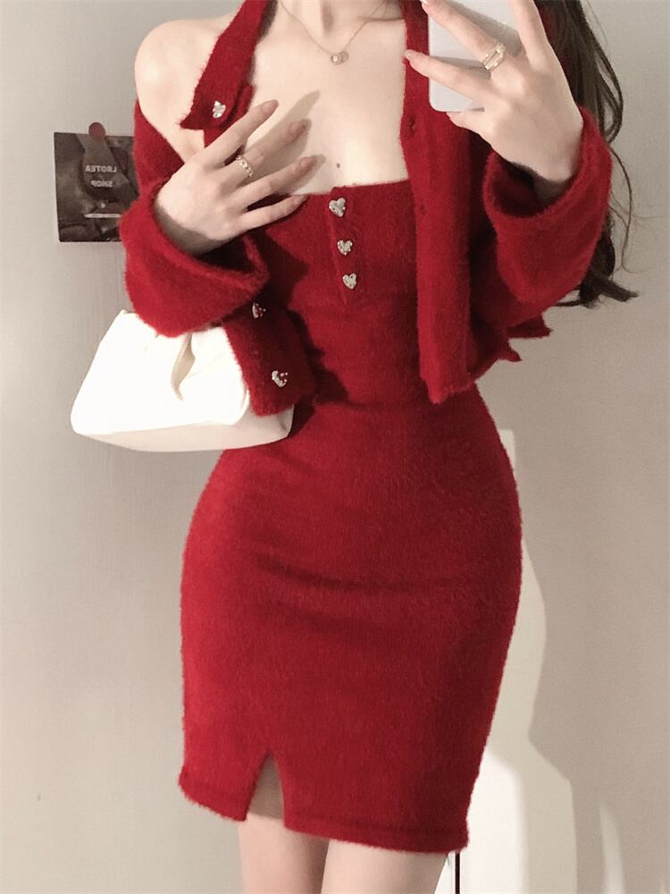 年ニット スーツ女性のスリム ホルター ドレス厚みのある豪華なショート カーディガン コート 2 点セット服 got99079615172