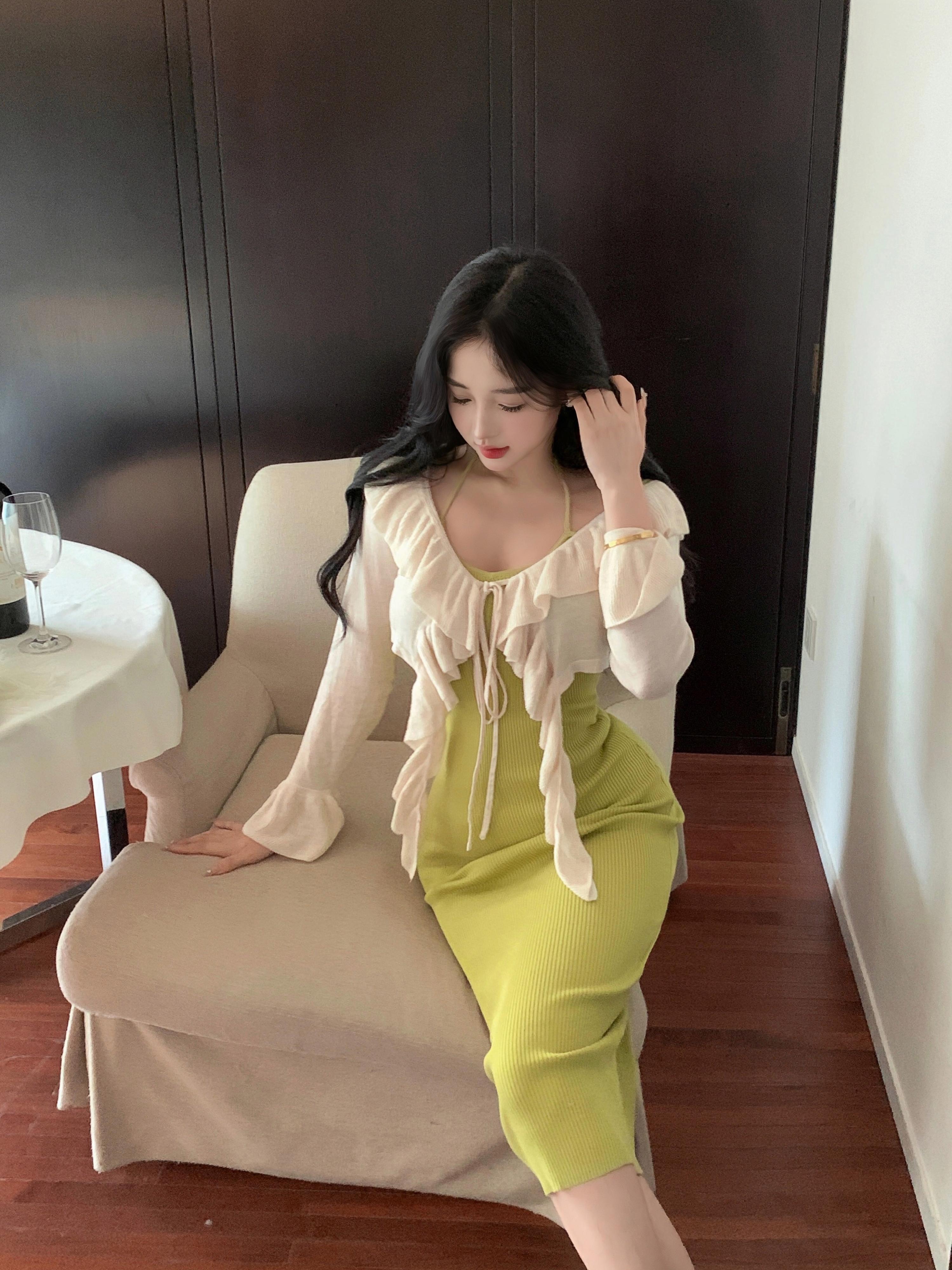 ホットガールスウィートスーツ女性のスリム長袖ニットカーディガングリーンスパゲティストラップドレス新鮮なツーピースセット服 ロング 大人ガーリー キュート カジュアル got22048693288