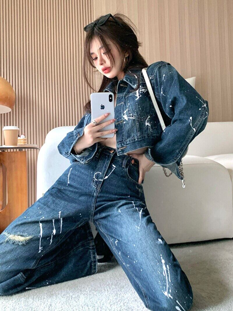 ホットガールレトロスーツ女性のスリムスプラッシュインクデニムコートストレートチューブワイドレッグパンツツーピースセット服 ワイドパンツ got74107337380