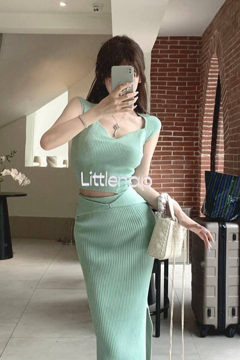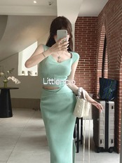 ホットガールスーツ女性のスクエアカラースリムフィットショートニットシャツウエストヒップラップスカートツーピースセット服 スクウェア got89255341861