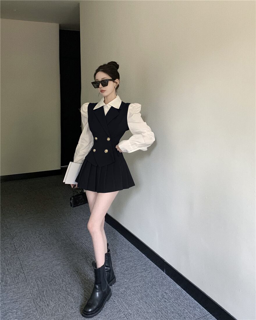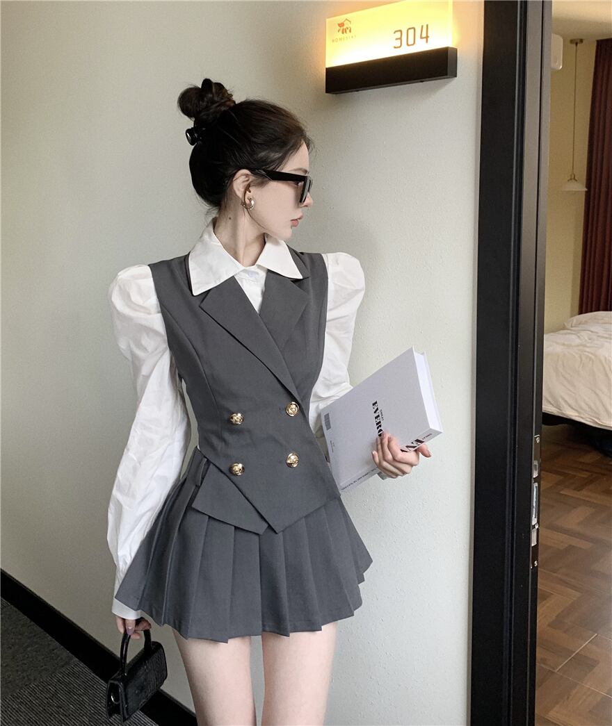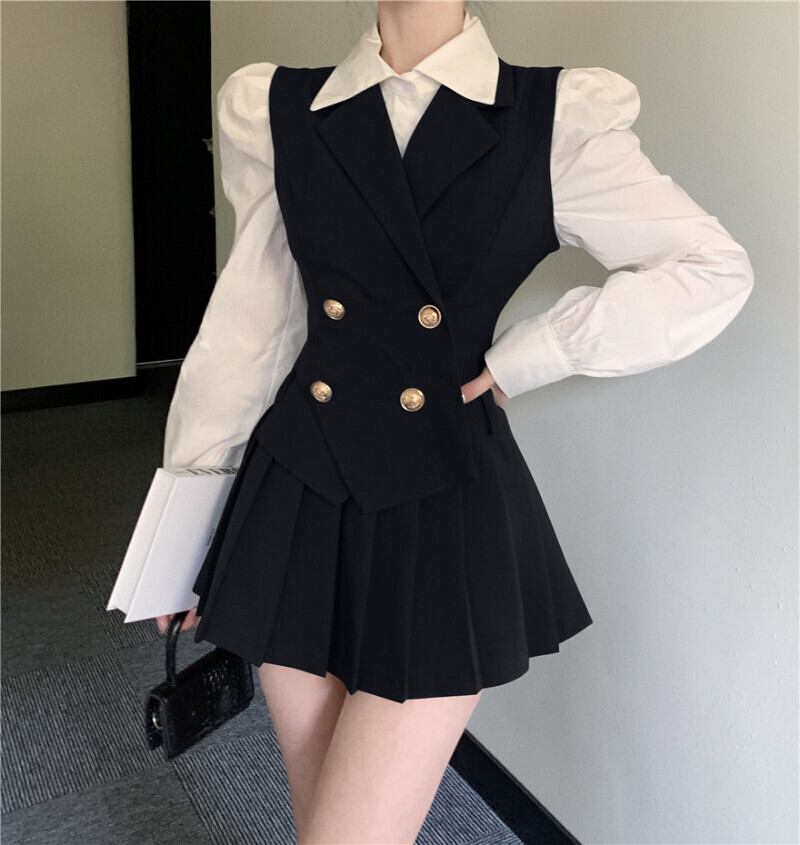 春スタイルスーツ女性のターンダウン襟ダブルブレストベストバブルスリーブシャツ A ラインプリーツスカート 3 点セット スプリング 春物 Aライン got38342444836