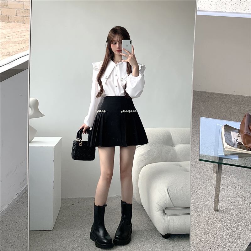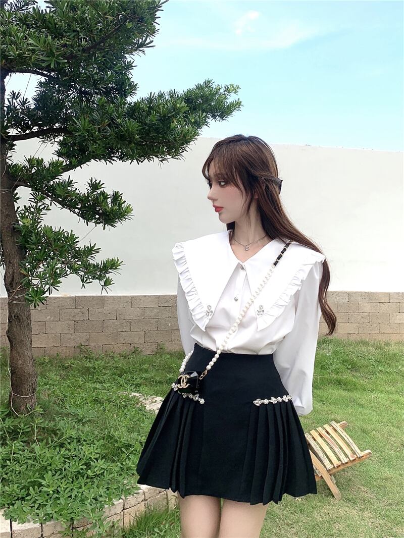 純粋なセクシーなスーツの女性の春ピーターパン襟フリルシャツウエストプリーツショートスカート 2 点セット服 スプリング 春物 got10963922600