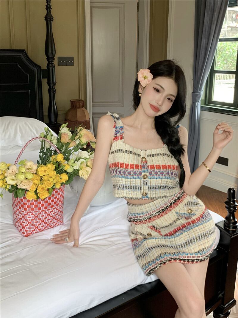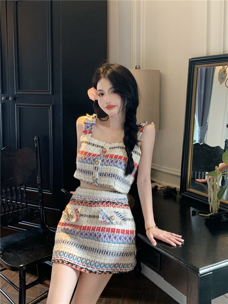 甘いホットガールスーツストライプサスペンダータンクトップ女性の春ショートラップヒップスカート 2 点セット服 大人ガーリー スウィート キュート カジュアル スプリング 春物 got59801874629