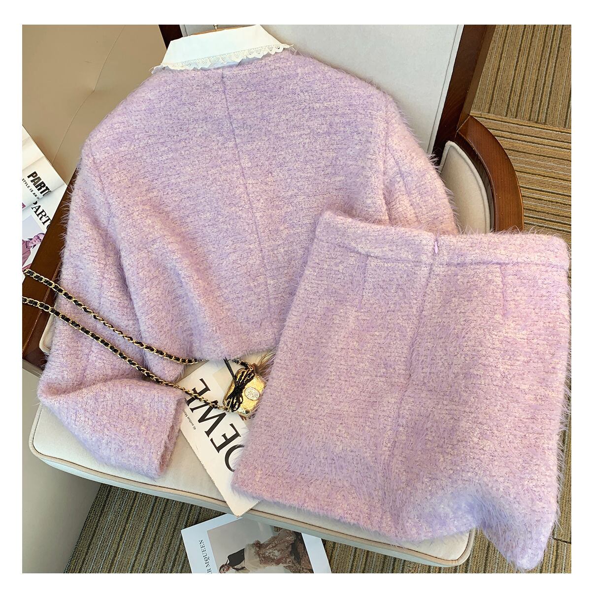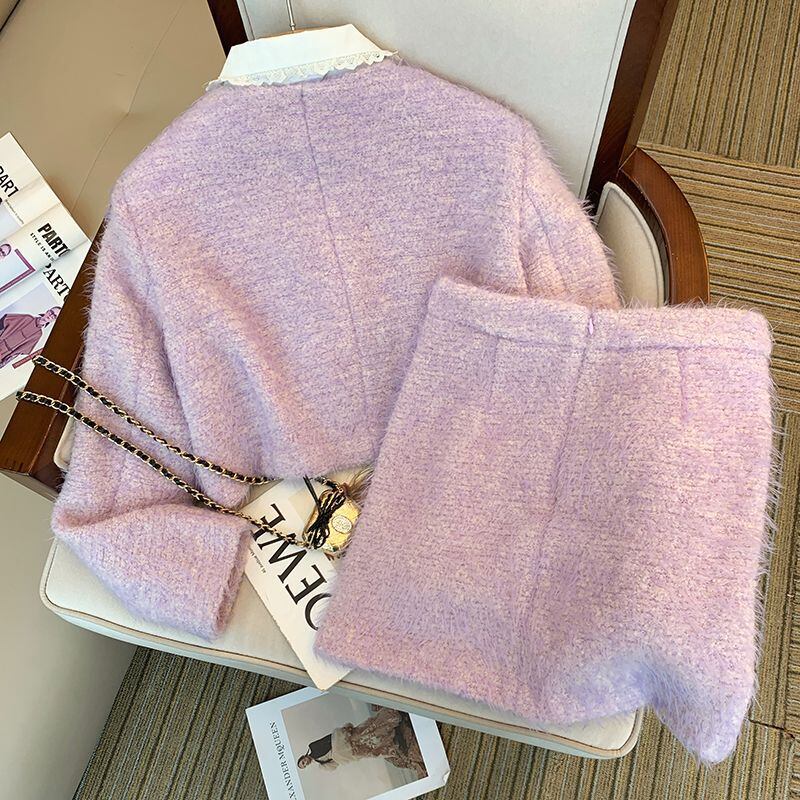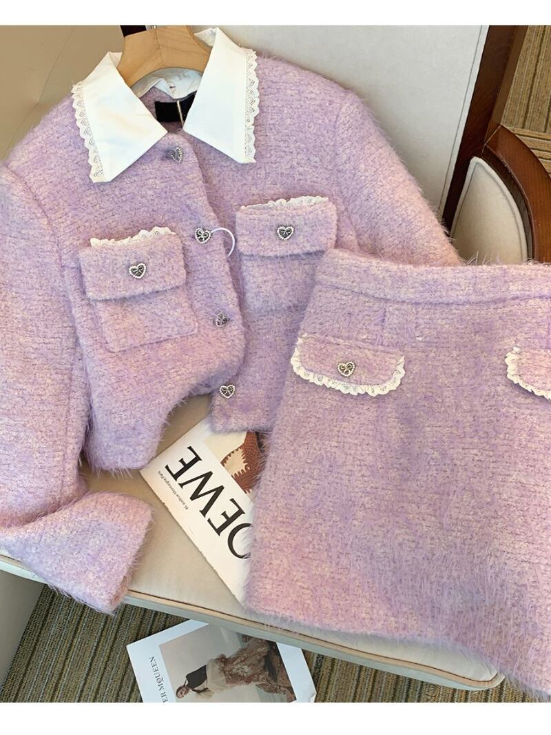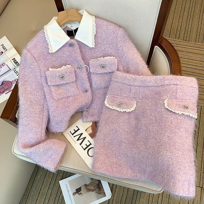 スウィートガールハートボタンスーツ女性の冬のターンダウンカラーロングスリーブショートコートウエストミニスカートツーピースセット 長袖 大人ガーリー キュート カジュアル ウィンター 冬物 got48983771478