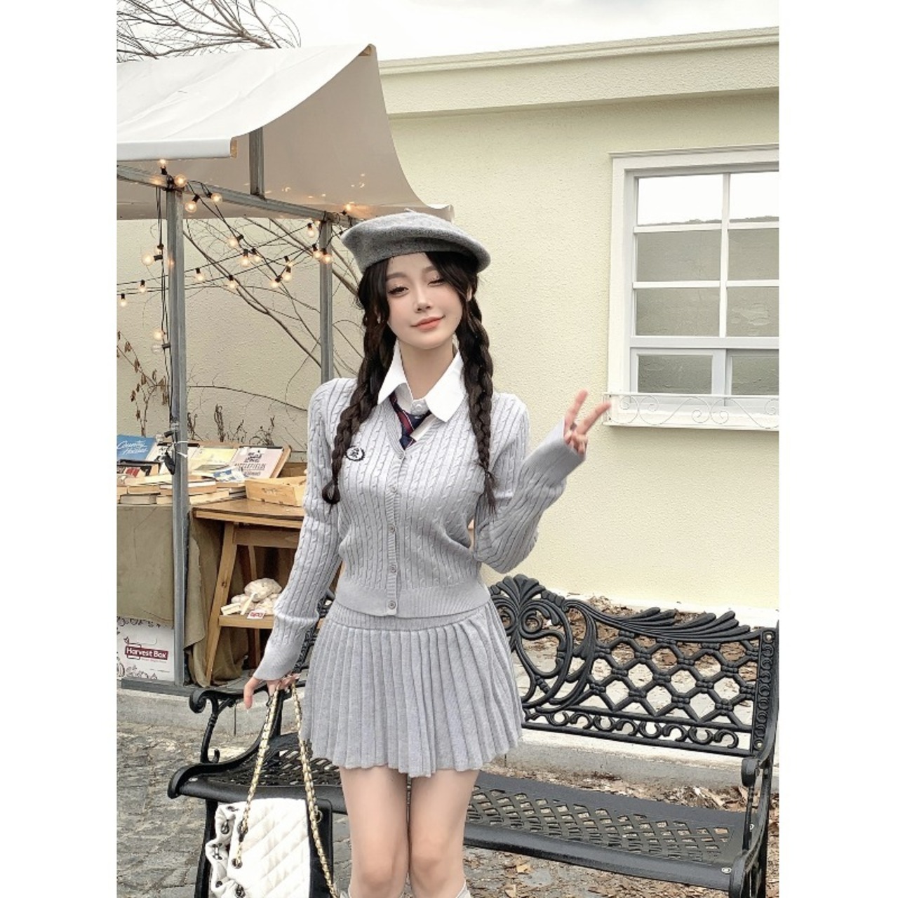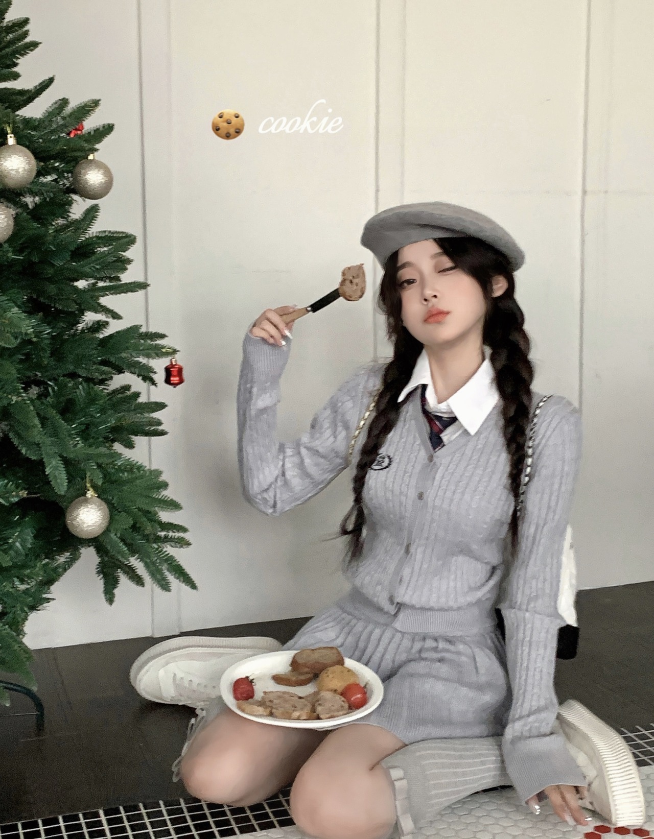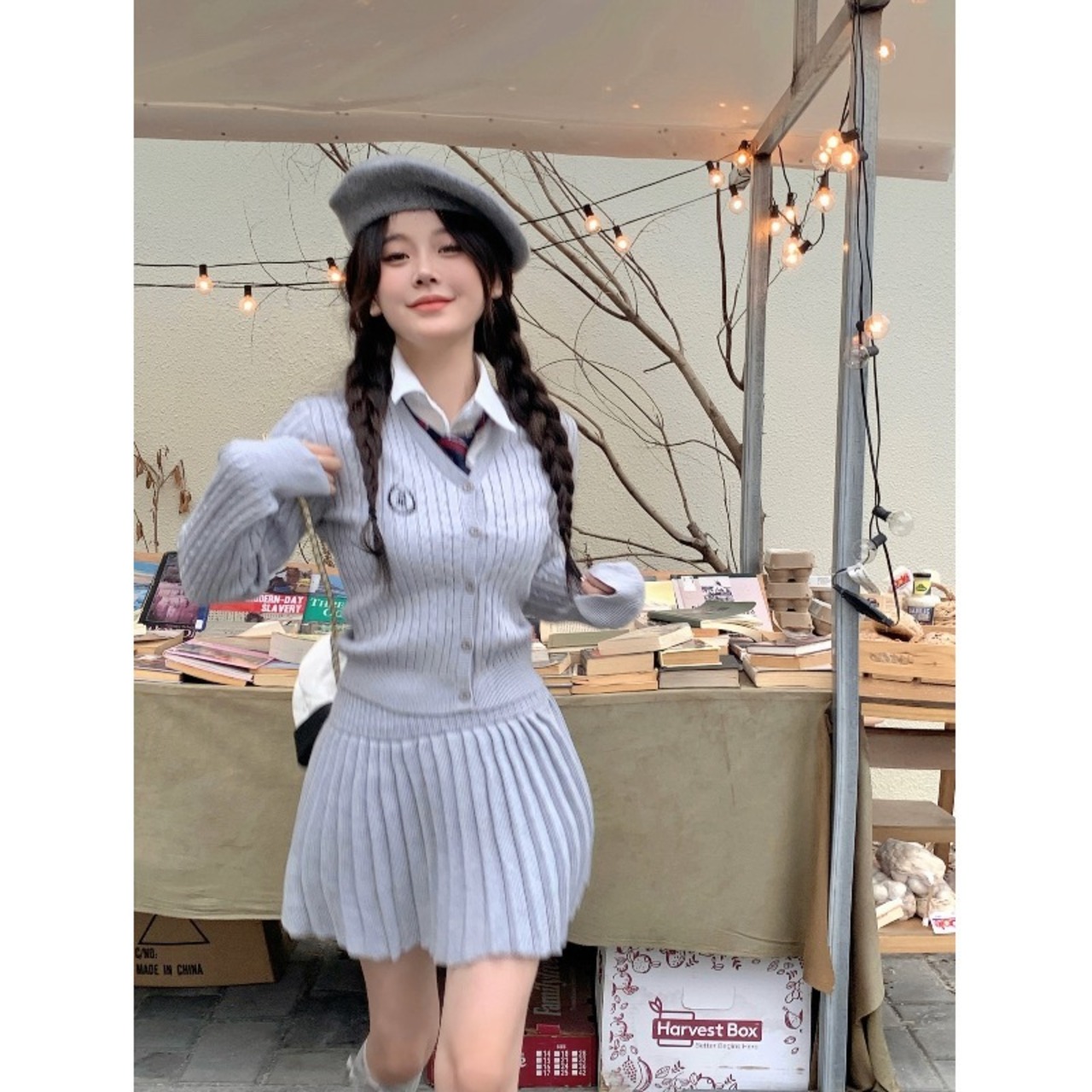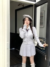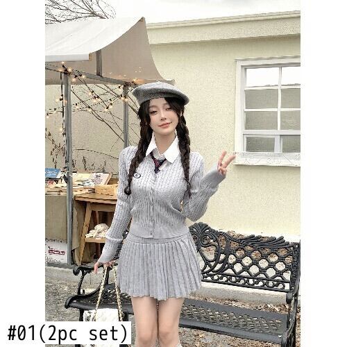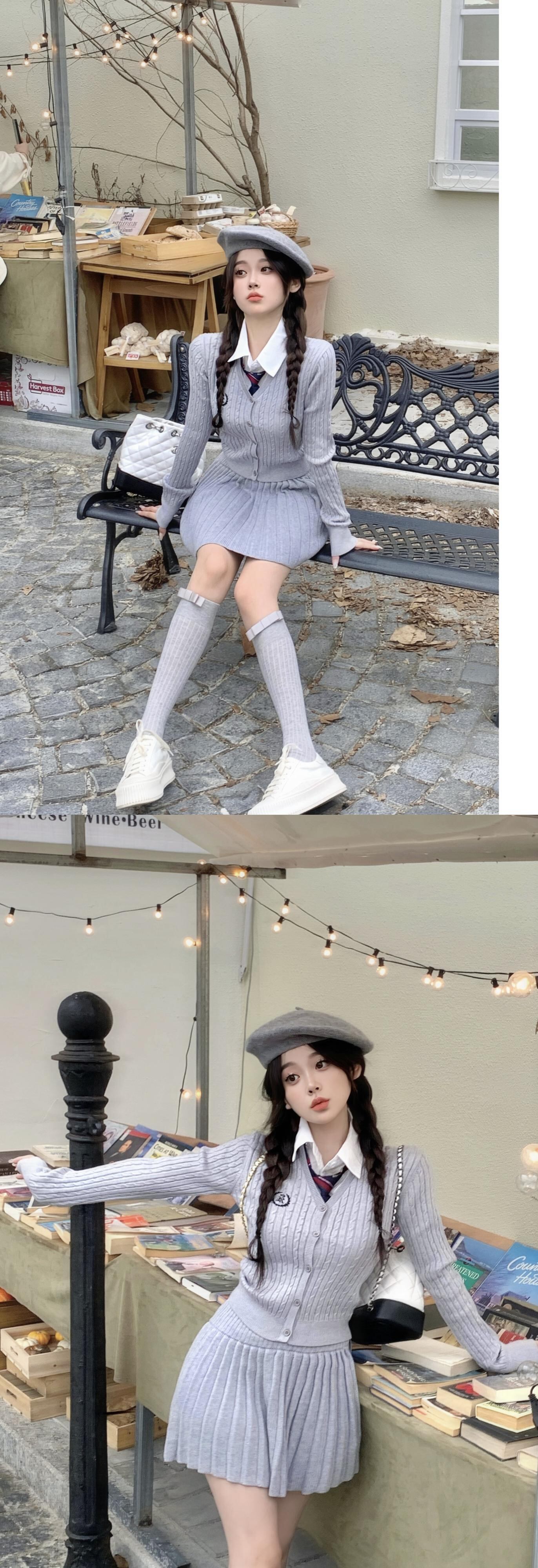 秋冬グレーニットスーツスリム長袖Vネックカーディガンウエストスカートツーピースセット服 ロング オータム 秋物 ウィンター 冬物 got92855487969
