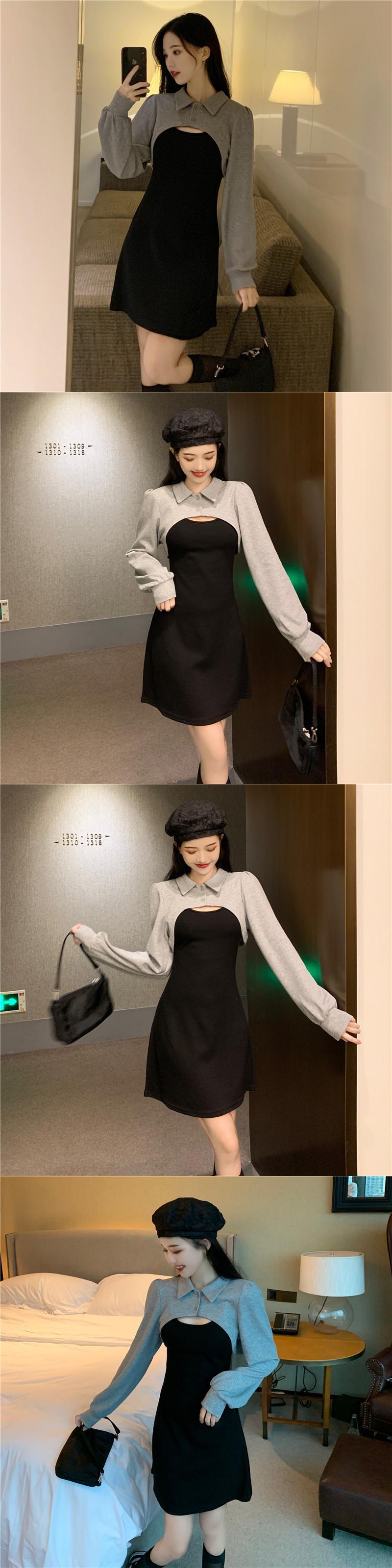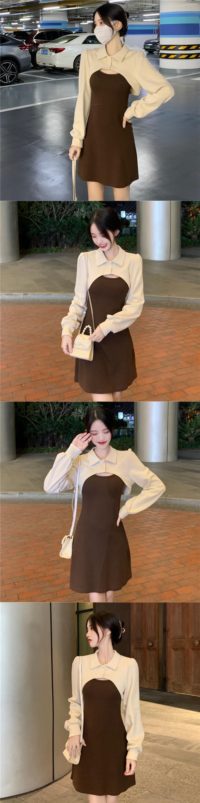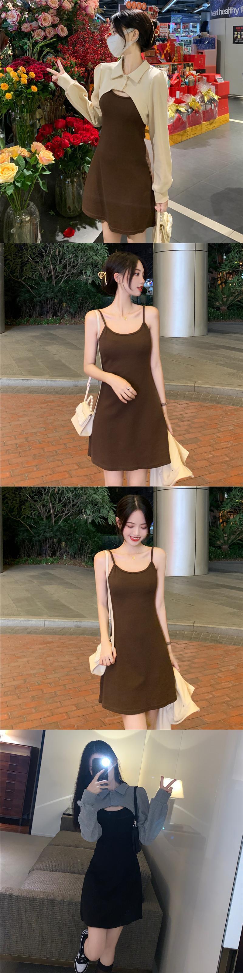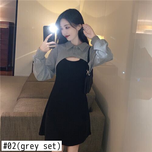スウィート ガール スーツ女性の無地サスペンダー ドレス スーパー ショート ポロ襟長袖トップ 2 点セット服 ロング 大人ガーリー キュート カジュアル ソリッドカラー got84275942733