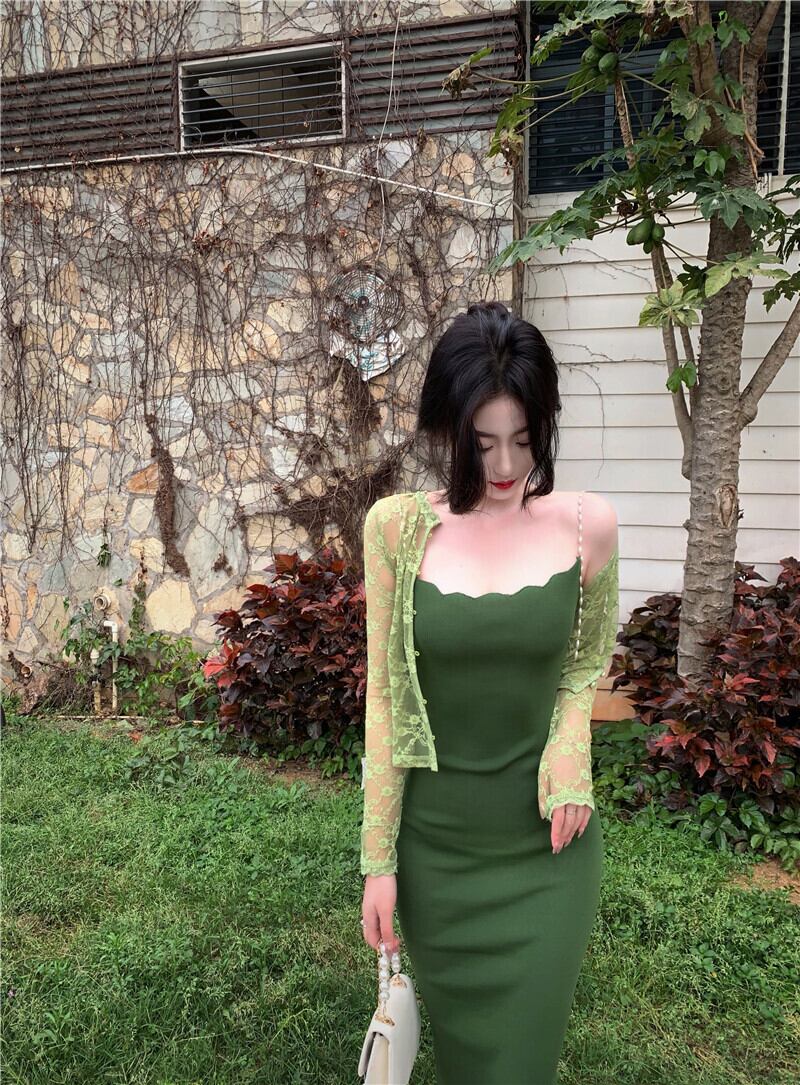 OLスーツ レディース パールウエスト ミドル丈 ニット スリングワンピース 長袖 レース 日焼け止め カーディガン 2点セット ロング 真珠 会社 学校 通勤や通学にも got26281538410