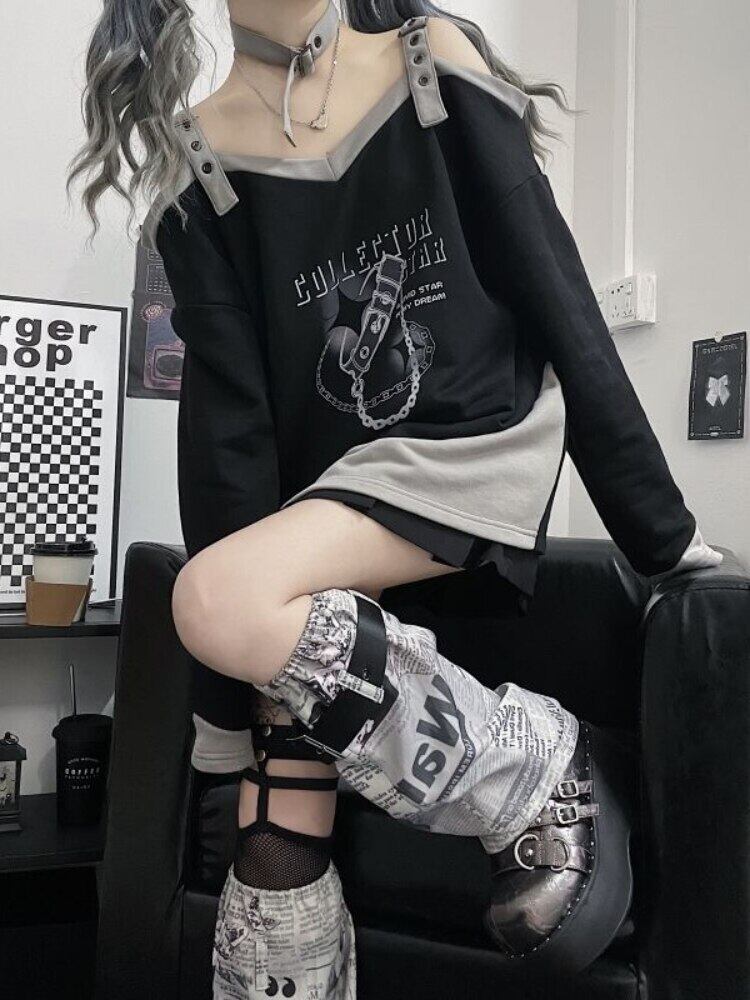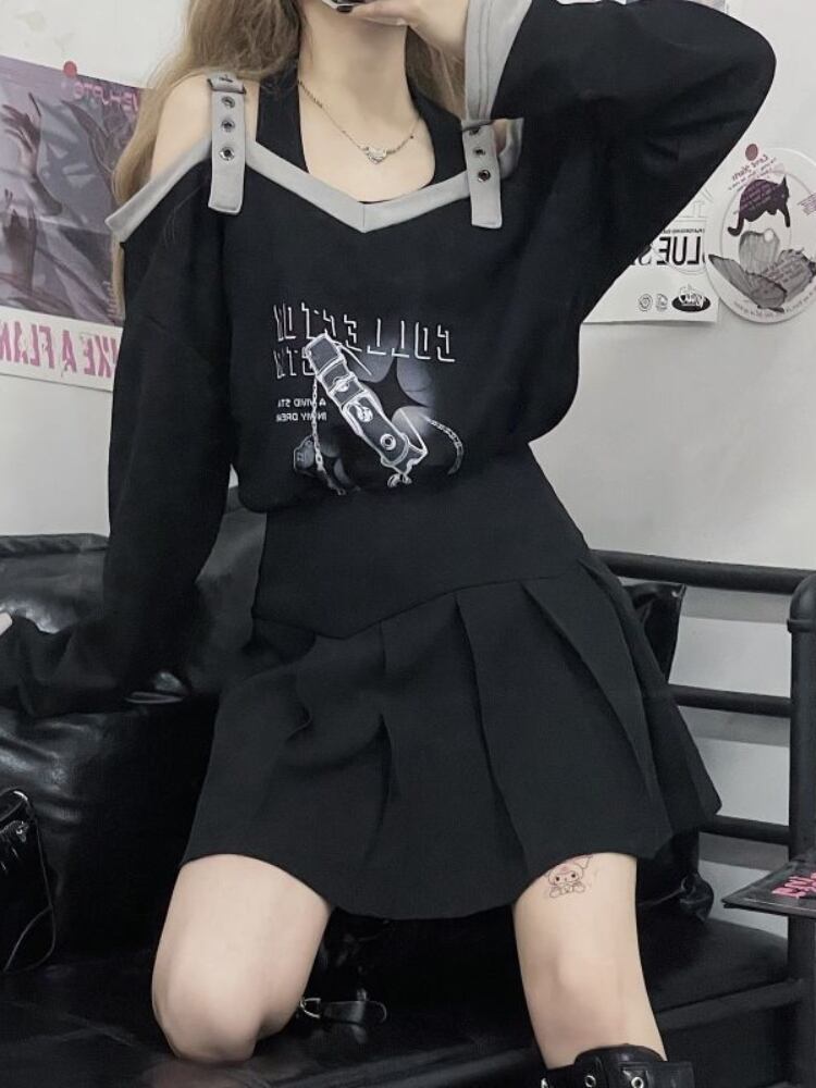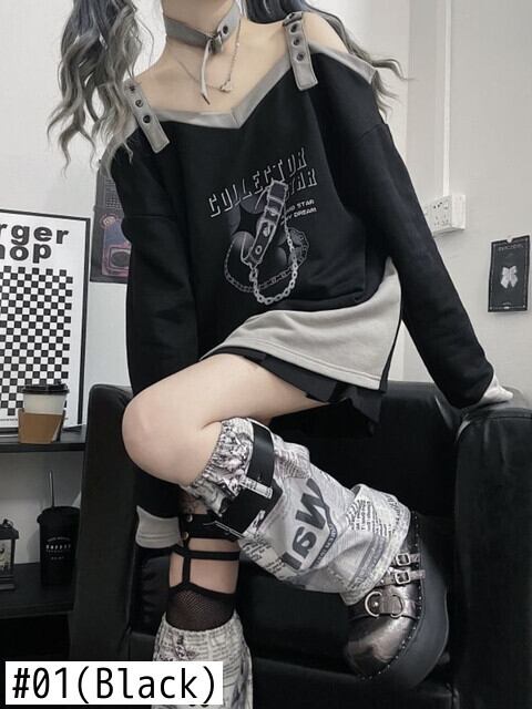 ゴシックパンク Tシャツワンショルダー黒 ese Y2k 長袖 Suumer 女性特大ストリート女性トップ Tシャツ ロング ブラック got79691498662