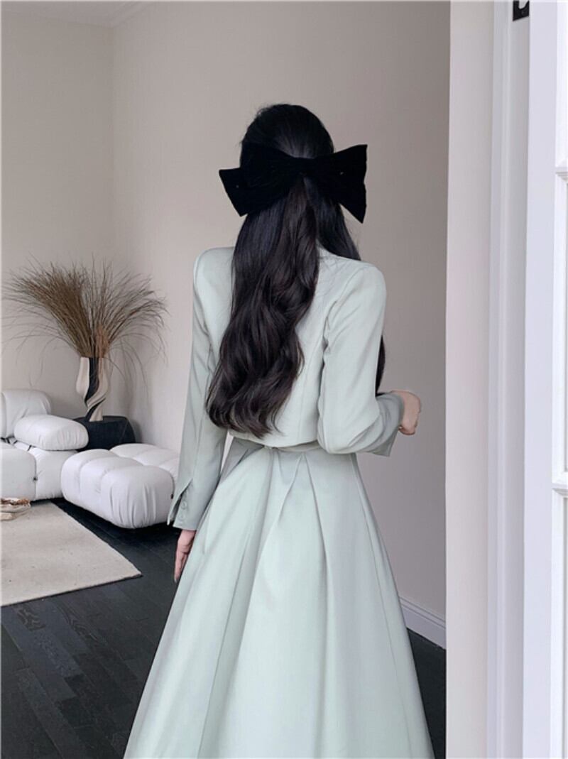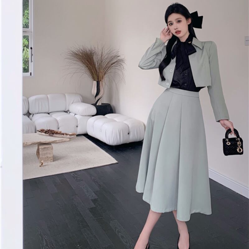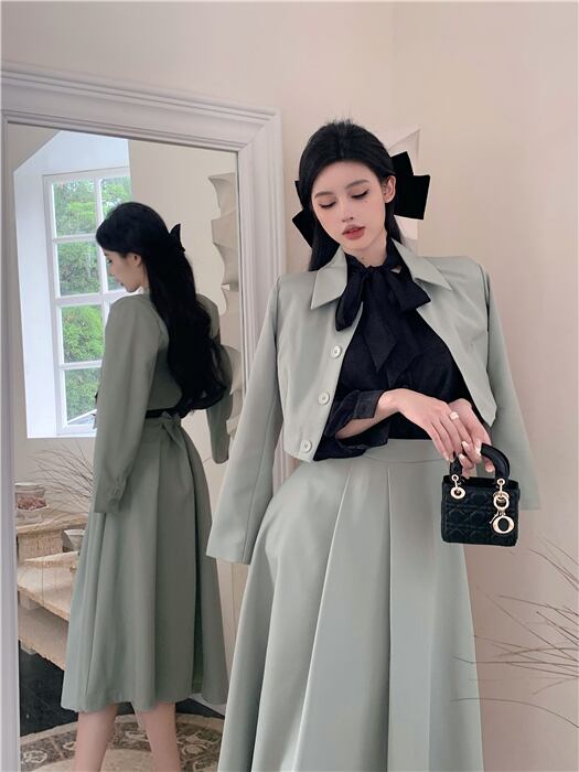 春秋スーツ レディース グリーン ショートスーツ コート ウエスト気質 ミディアム丈 スカート 2点セット スプリング 春物 オータム 秋物 got54572739466