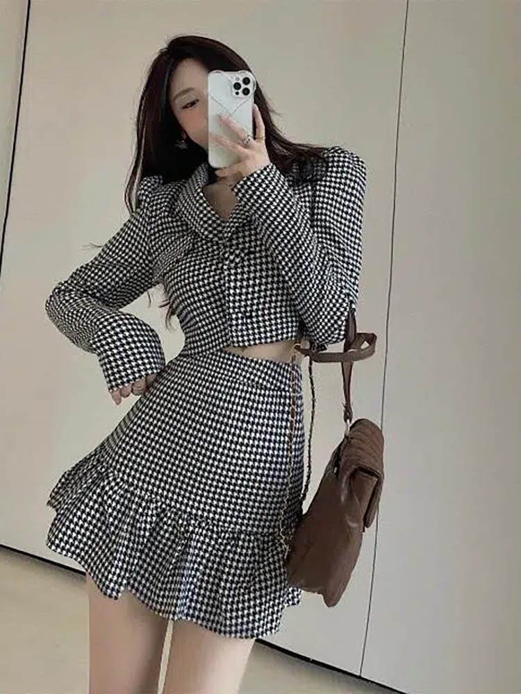 ツーピースセットレディース衣装スウィートホットガールズパフスリーブトップミニスカート格子縞の梨花服秋/冬のスカートセット 大人ガーリー キュート カジュアル オータム 秋物 ウィンター 冬物 got21494862861