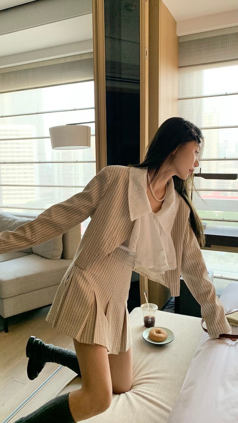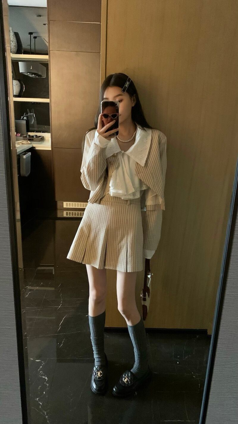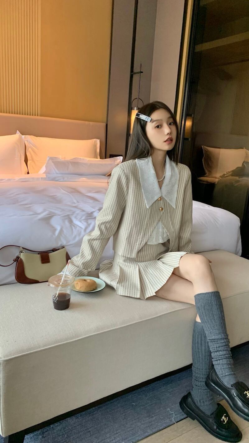 プレッピースタイルスーツレディースストライプスーツコート白レースシャツ秋冬プリーツスカート3点セット服 ホワイト オータム 秋物 ウィンター 冬物 got52088131767