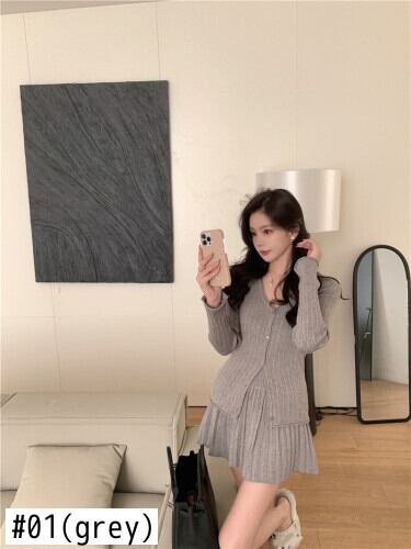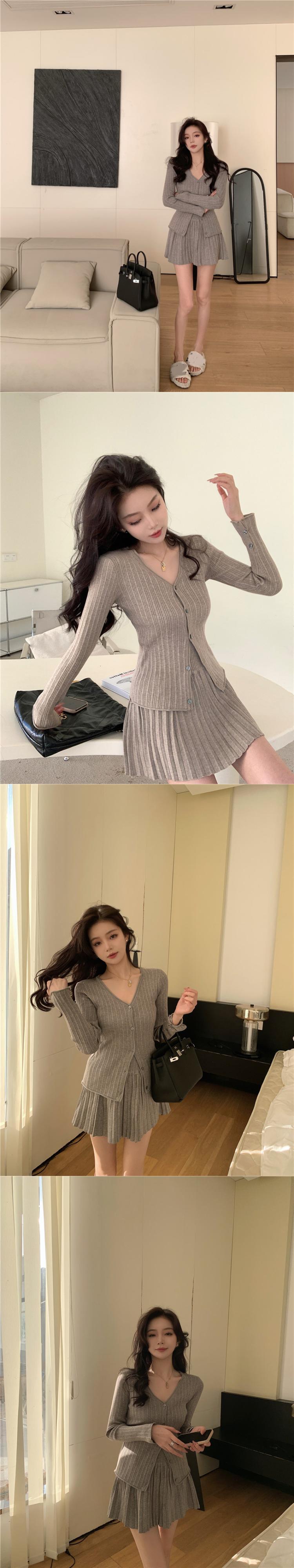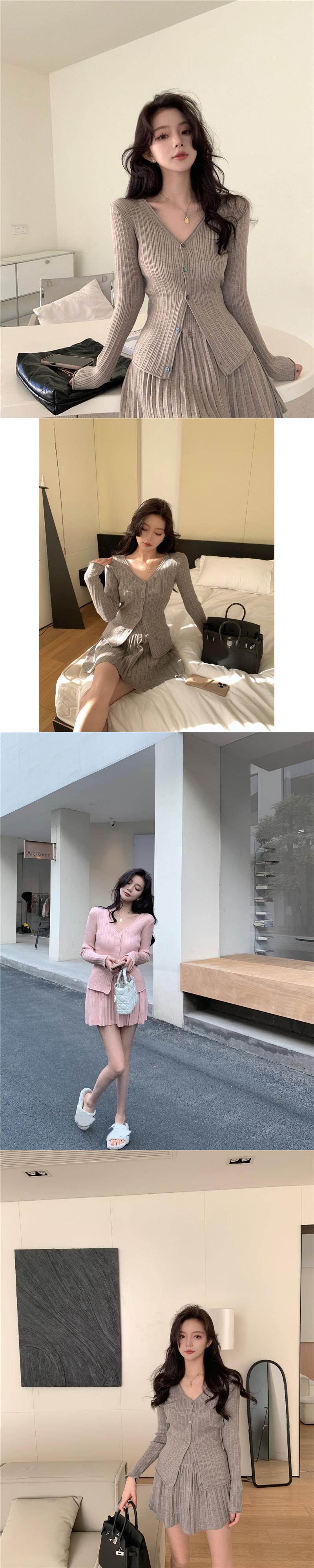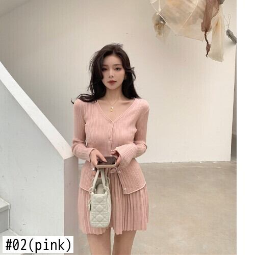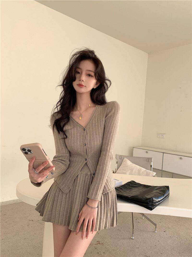 女子通勤スーツ Vネック 長袖 ニットカーディガン レディース 秋冬 ウエストプリーツスカート 2点セット ロング オータム 秋物 ウィンター 冬物 got72662886489