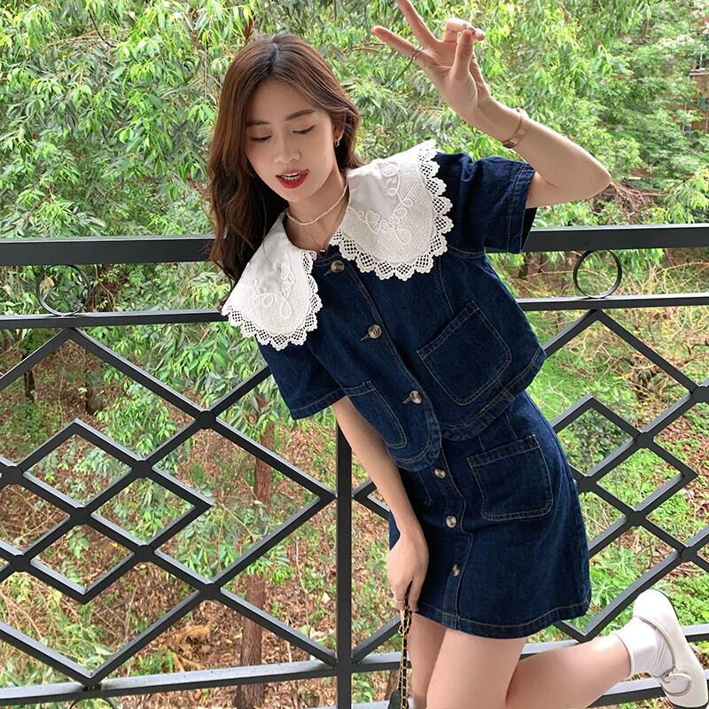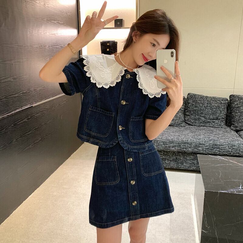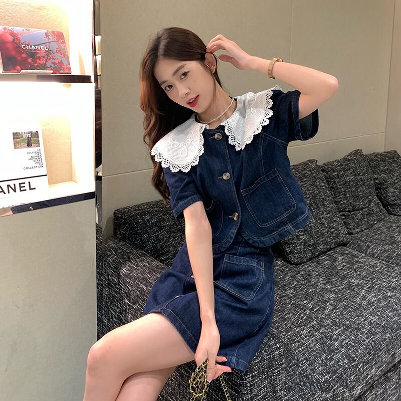 フレンチスタイルデニムスーツ女性の春中空アウトピーターパン襟トップボタンスカート 2 点セット服 スプリング 春物 got12208690505