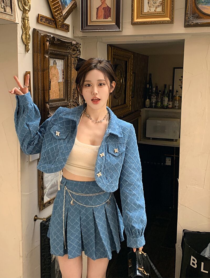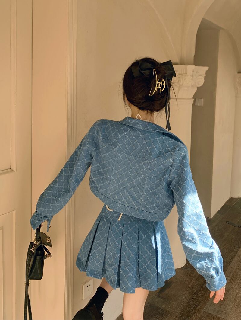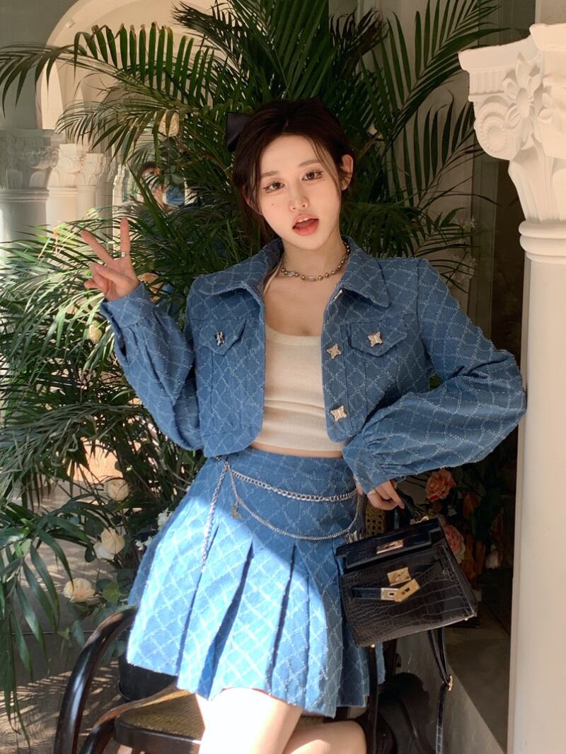 ホットガール春のスーツの女性のデニムジャケットウエストスリムショートプリーツスカート 2 点セット服 スプリング 春物 got44345321142