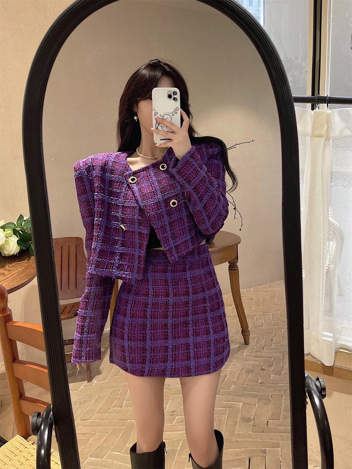スウィートガールスーツレディース秋冬レトロパープルチェック柄長袖コートミニスカートツーピースセット ロング 大人ガーリー キュート カジュアル オータム 秋物 ウィンター 冬物 got22449089640