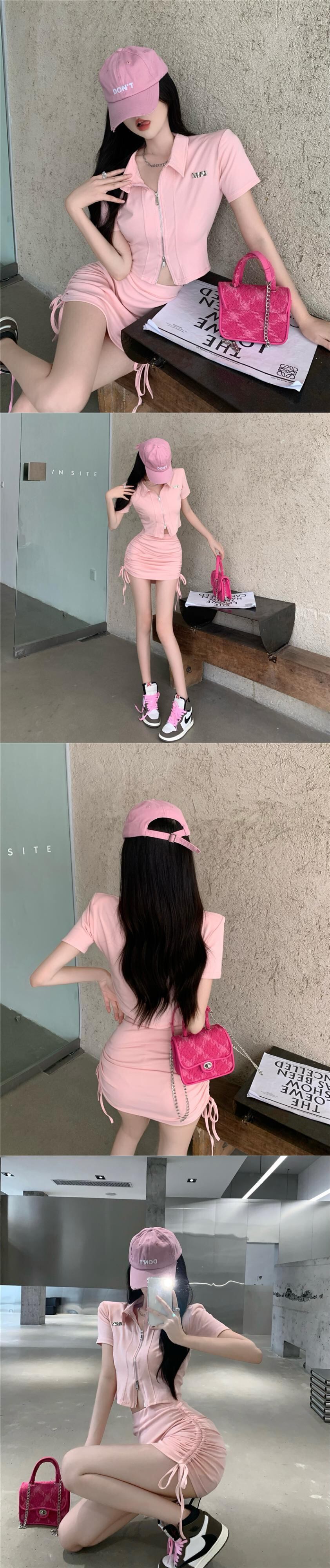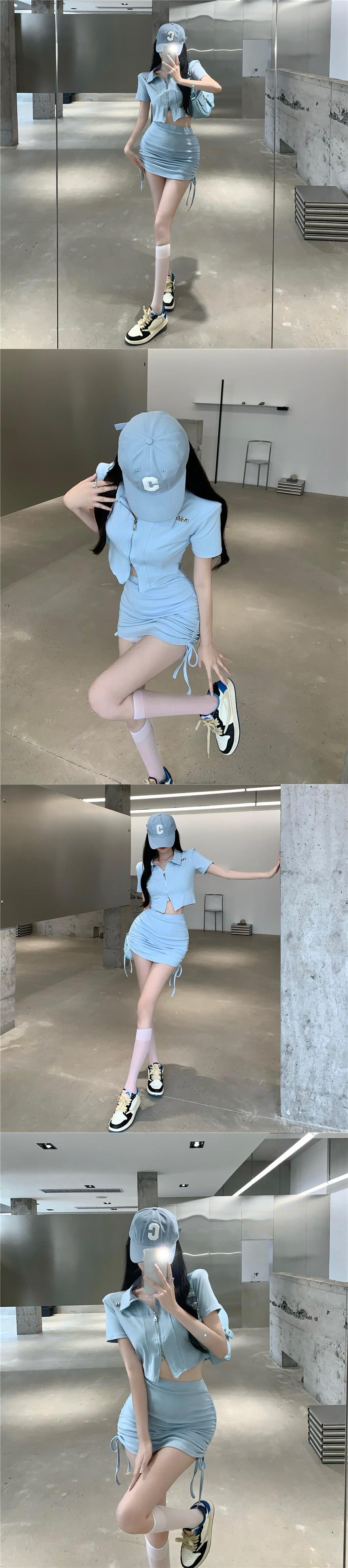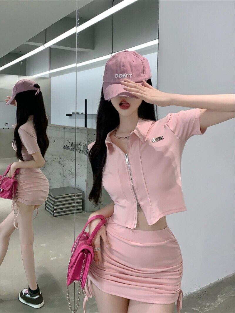 スウィートガールスーツレディースダブルジップターンダウンカラーハーフスリーブジャケットトップドローコードスカートツーピースセット服 大人ガーリー キュート カジュアル got71596320938