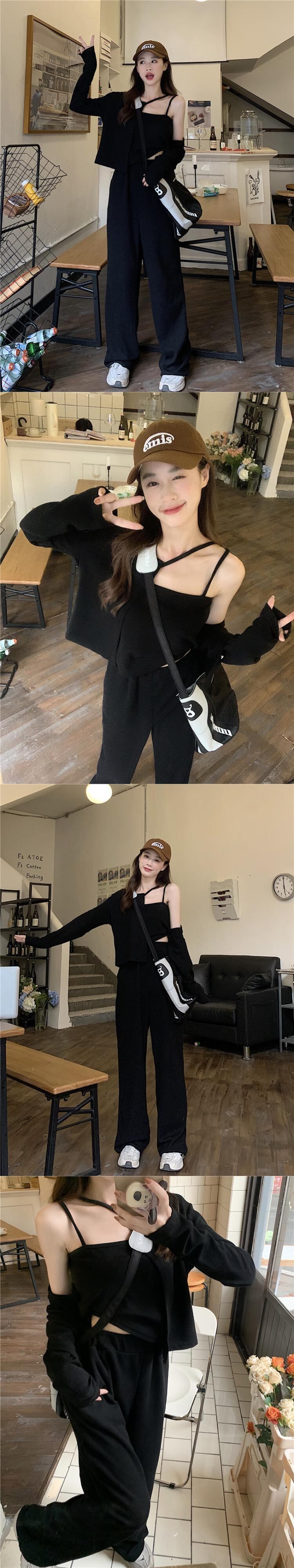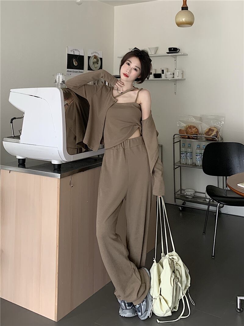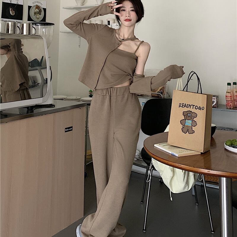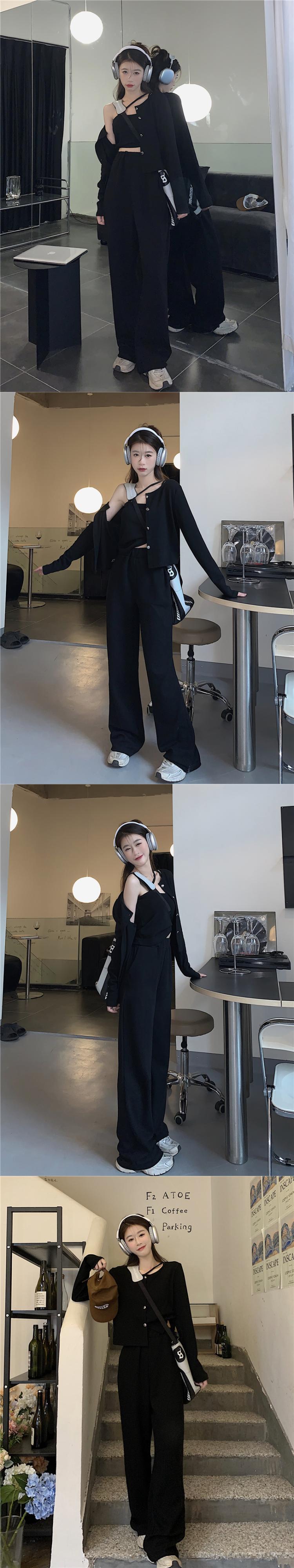 スーツ レディース ニット カーディガン コート サスペンダー トップス 春 ワイドパンツ 3点セット 洋服 スプリング 春物 ワイドレッグ got62593293053
